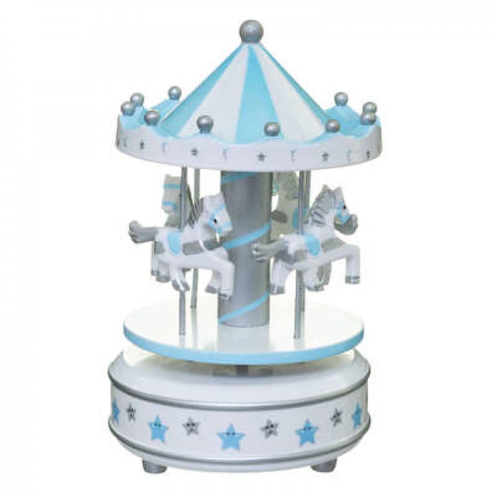 Ξύλινο μουσικό καρουζέλ σε λευκό-μπλε χρώμα με πολύχρωμα αλογάκια. Ιδανικό για διακοσμήσεις και ως δώρο σε μια πολύ όμορφη συσκευασία.