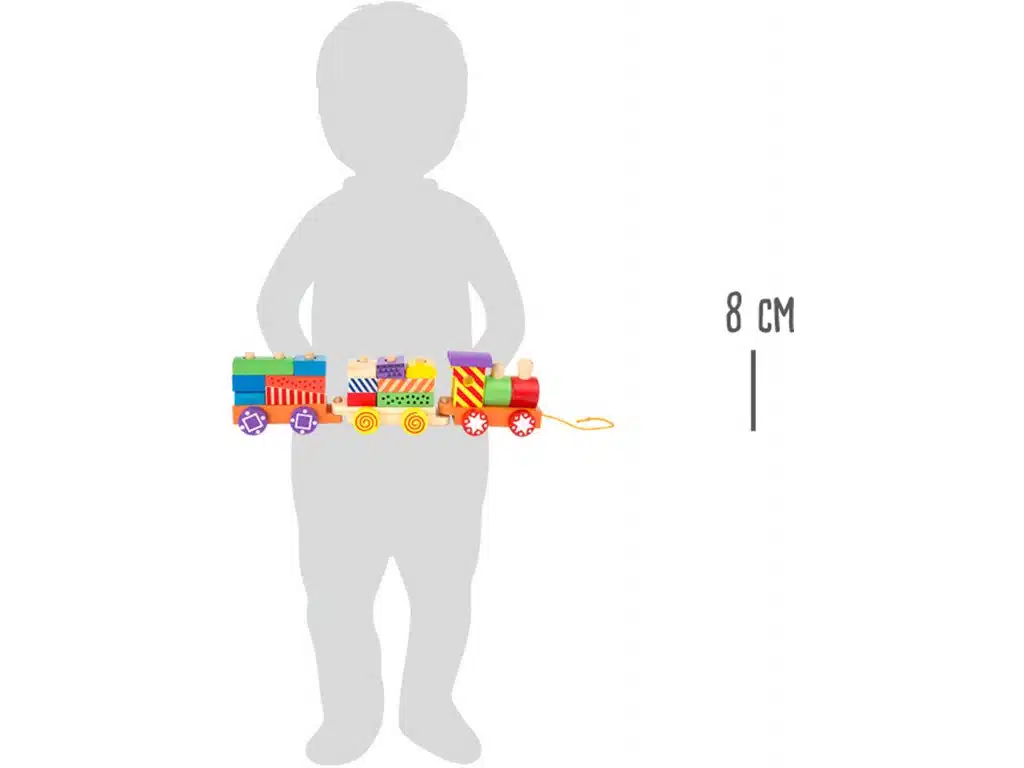Ένα τρένο με πολλά υπέροχα χρώματα! Μπορεί να αλλάξει το χρώμα του όπως θέλετε, απλώς αναδιατάσσοντας τα πολύχρωμα ξύλινα τουβλάκια. Η ατμομηχανή και τα δύο βαγόνια μπορούν να συνδεθούν μαζί και να τραβηχτούν πίσω από μια ζώνη.
