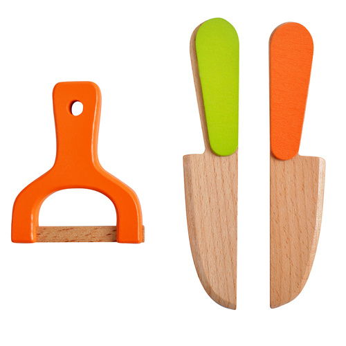 Χάρη στα δύο μαχαίρια και τη ξύλινη επιφάνεια κοπής που περιλαμβάνονται, το παιδί μπορεί να “κόψει” τα φρούτα και τα λαχανικά στη μέση — και στη συνέχεια να τα ενώσει ξανά με velcro!