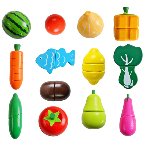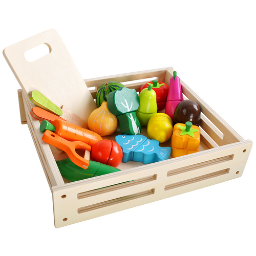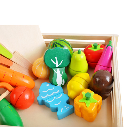 Το σετ περιλαμβάνει ρεαλιστικά αντίγραφα φρούτων και λαχανικών, κατασκευασμένα από ξύλο υψηλής ποιότητας, βαμμένα με ασφαλή, μη τοξικά χρώματα.