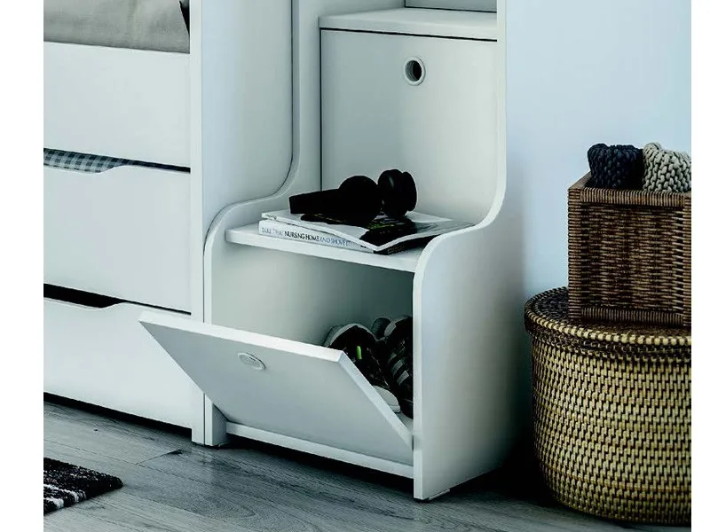 Η παιδική κουκέτα με αποθηκευτικά σκαλοπάτια διαθέτει σταθερές σκάλες με ενσωματωμένα ντουλάπια, προσφέροντας επιπλέον χώρο για παιχνίδια, ρούχα ή λευκά είδη. Έτσι αξιοποιείται κάθε σημείο της κατασκευής, βοηθώντας στη διατήρηση της τάξης στο δωμάτιο.