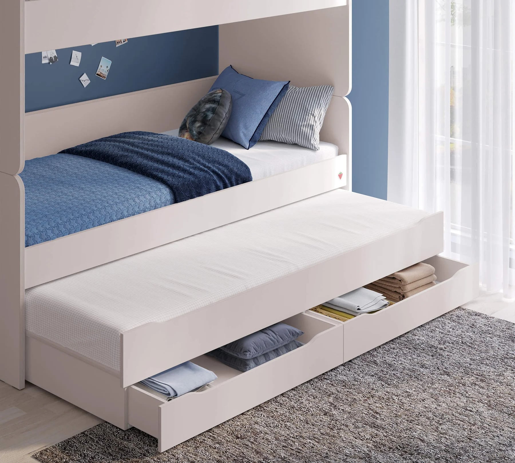 Το κάτω κρεβάτι διαθέτει επιπλέον συρτάρι που δέχεται στρώμα, το οποίο μπορεί να χρησιμοποιηθεί ως τρίτο κρεβάτι για φίλους που διανυκτερεύουν ή ως μεγάλος αποθηκευτικός χώρος. Με αυτόν τον τρόπο η κουκέτα προσαρμόζεται στις ανάγκες της οικογένειας και του παιδιού.