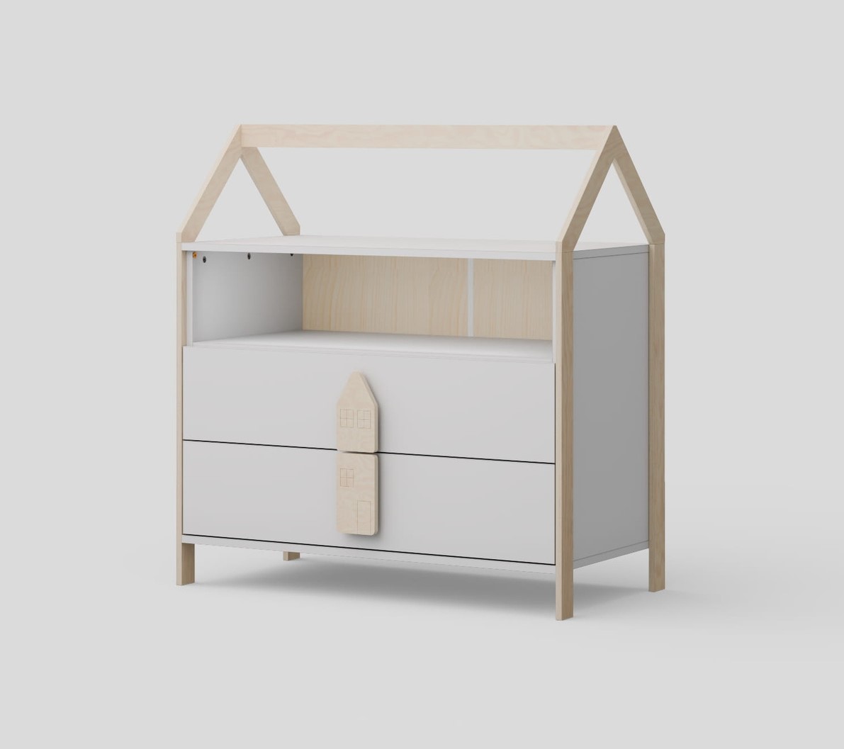 Ένα έπιπλο που εξελίσσεται – Το ιδιαίτερο σχήμα σπιτιού ενθουσιάζει τα μικρότερα παιδιά, ενώ χάρη στην αφαιρούμενη οροφή, η συρταριέρα μετατρέπεται εύκολα σε ένα πιο minimal έπιπλο, κατάλληλο και για εφηβικό δωμάτιο.