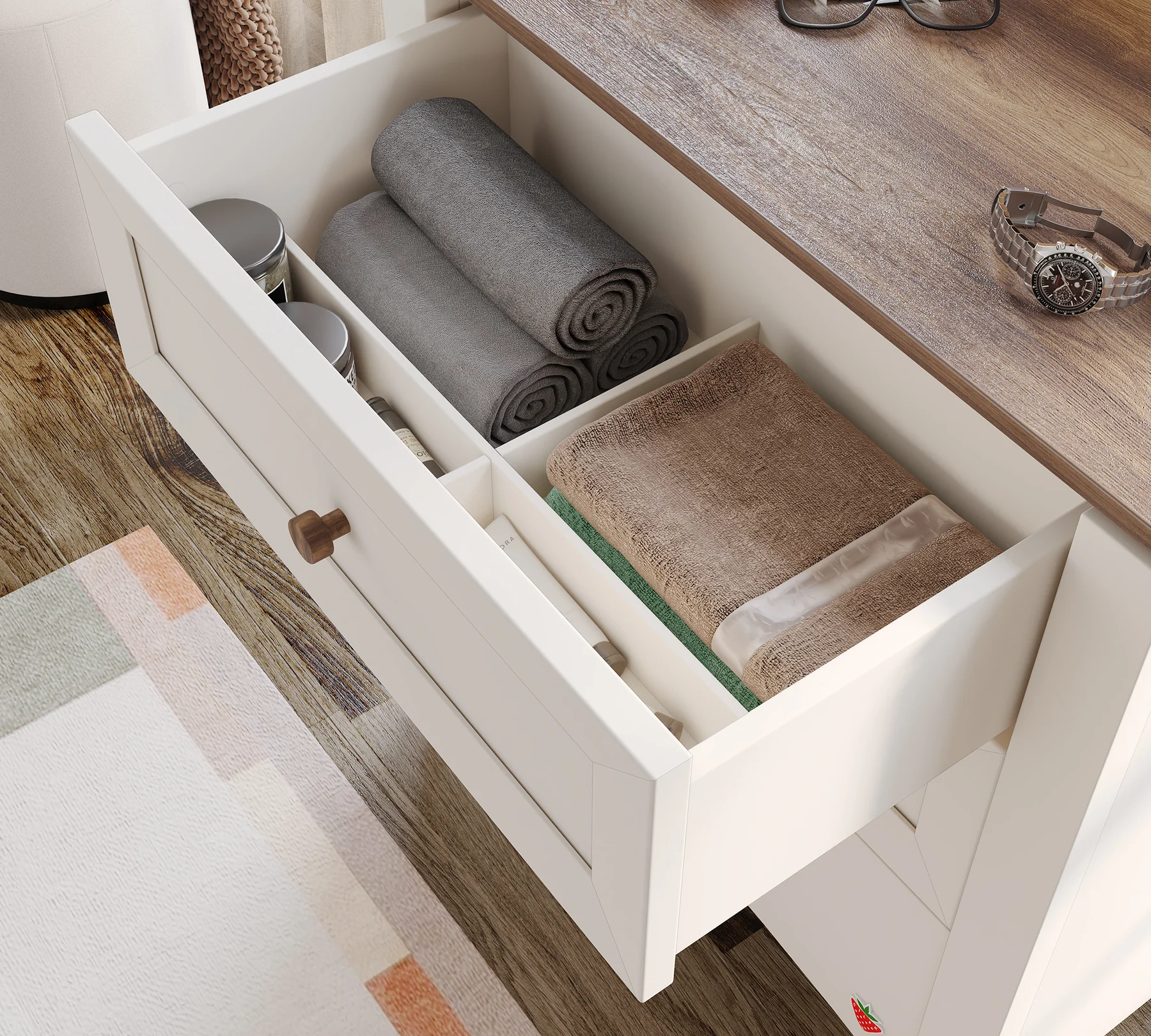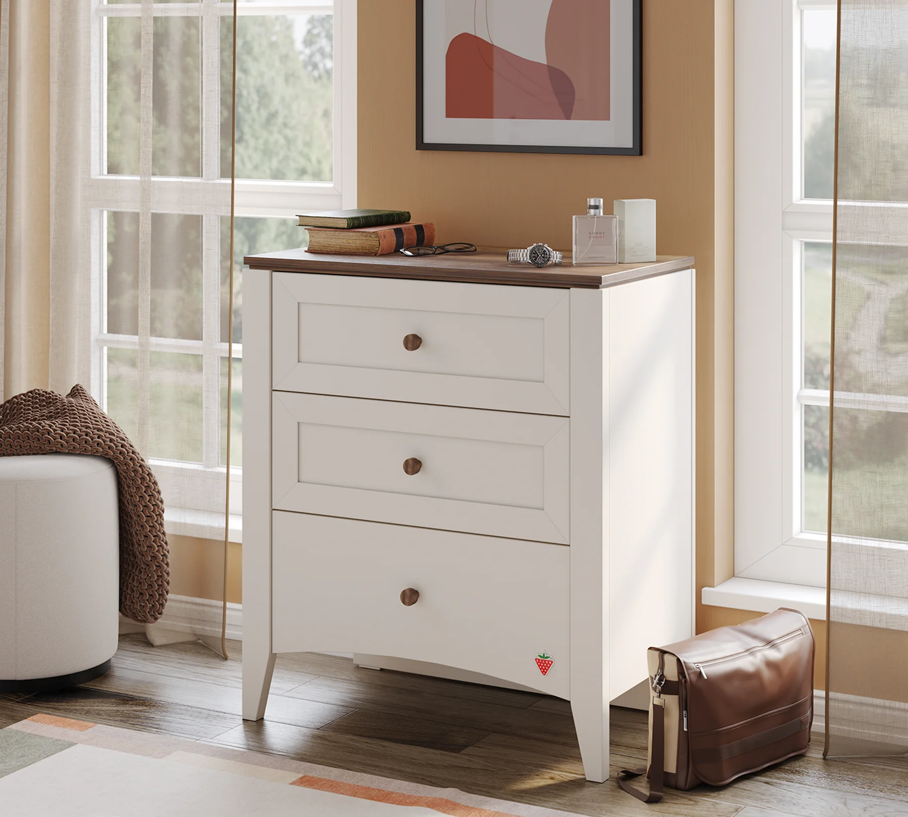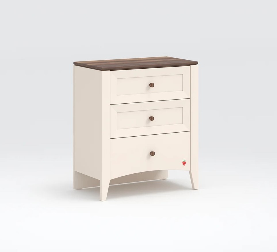 Διαθέτει τρία ευρύχωρα συρτάρια με μηχανισμούς ασφαλείας και ξύλινες λαβές από ξύλο καρυδιάς που προσφέρουν φυσική και ζεστή ατμόσφαιρα στο δωμάτιο.