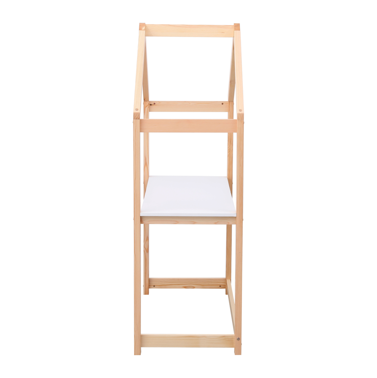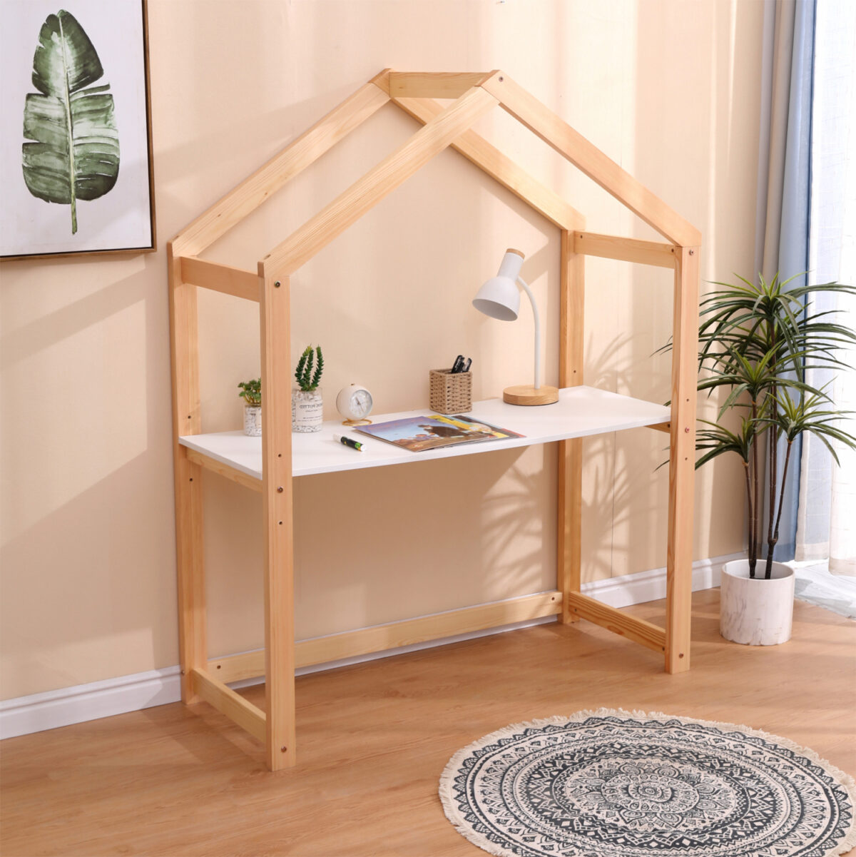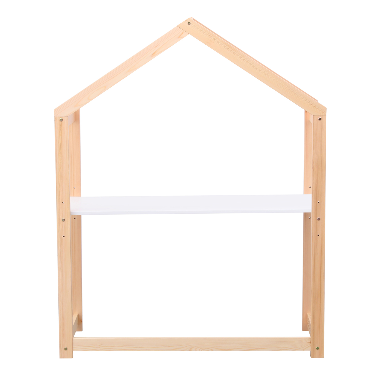 Το γραφείο διαθέτει επιφάνεια σε λευκό χρώμα, ενώ ο σκελετός του είναι κατασκευασμένος σε φυσικό χρώμα ξύλου και έχει σχέδιο σπιτάκι, προσφέροντας μια ζεστή και παιχνιδιάρικη αισθητική που ταιριάζει ιδανικά σε κάθε παιδικό δωμάτιο.