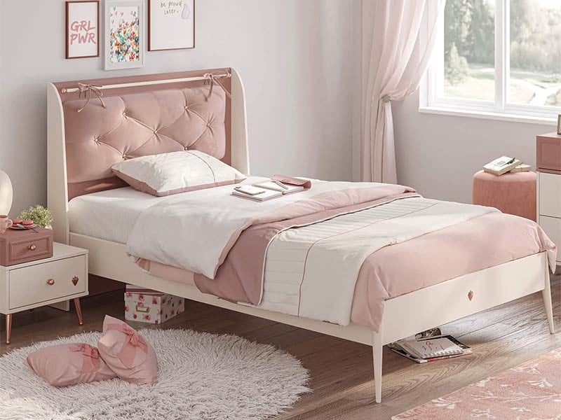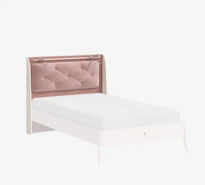 Το ιδιαίτερο κεφαλάρι σε σομόν απόχρωση προσφέρει μια ζεστή και μοντέρνα αίσθηση στο δωμάτιο, δημιουργώντας ένα κομψό αποτέλεσμα που ταιριάζει ιδανικά σε παιδικά και εφηβικά δωμάτια. Ο σχεδιασμός του κρεβατιού συνδυάζει αισθητική και λειτουργικότητα, προσφέροντας έναν άνετο χώρο για καθημερινή ξεκούραση.