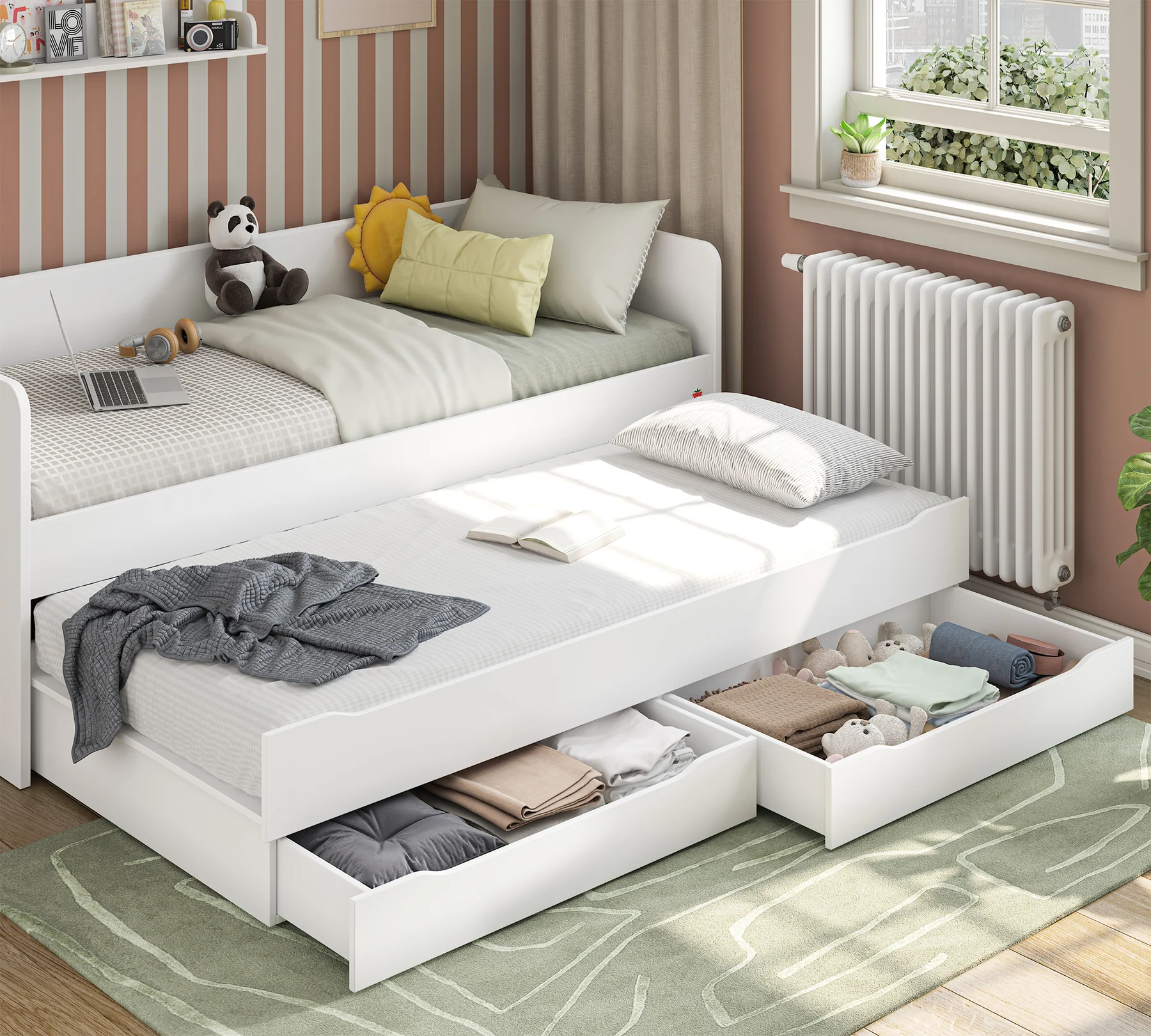 Δημιουργήστε το τέλειο παιδικό δωμάτιο για το παιδί σας! Εμπνευστείτε από αυτόν τον κομψό και λειτουργικό σχεδιασμό που βλέπετε στη φωτογραφία και χαρίστε στο παιδί σας ένα χώρο που θα αγαπήσει. Ένα κρεβάτι με αποθηκευτικό χώρο, όπως αυτό της φωτογραφίας, είναι ιδανικό για να αποθηκεύετε παιχνίδια, ρούχα και βιβλία. Το συρόμενο κρεβάτι από κάτω είναι τέλειο για φιλοξενία φίλων.