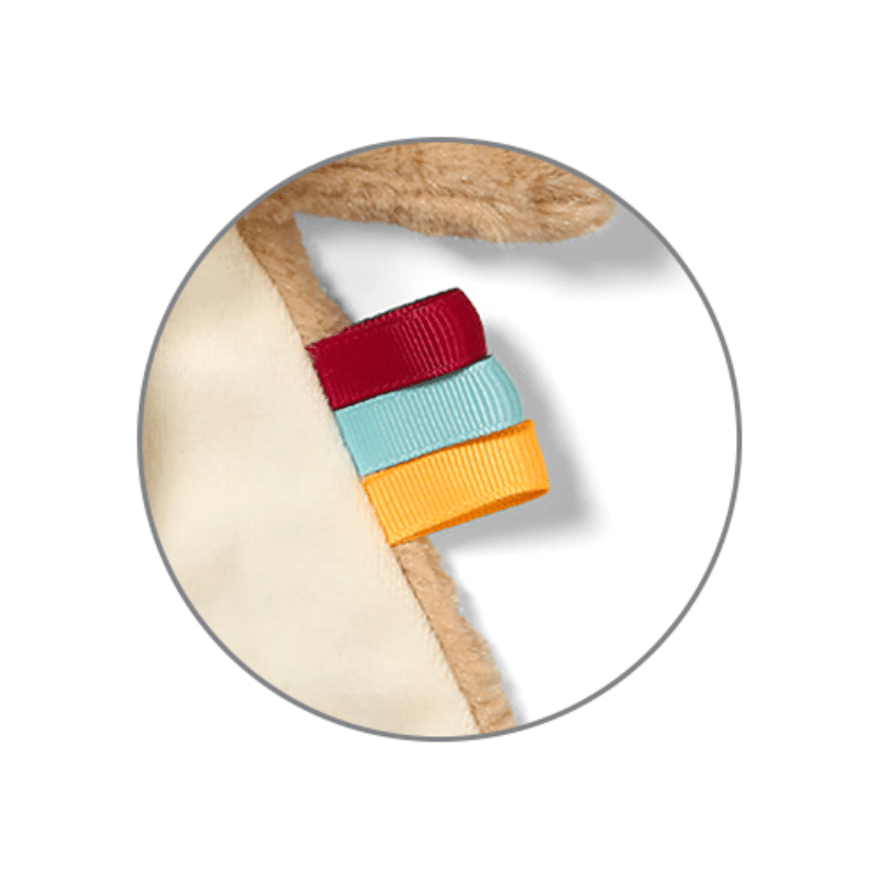 Διαθέτει θήκη για πιπίλα για να αποκοιμιέται όχι μόνο από την ίδια αλλά και από τη μοναδική αίσθηση που θα αισθάνεται από το λούτρινο χαϊδεύοντάς το. Οι πολύχρωμες ετικέτες στο πλαϊνό μέρος, θα ενισχύσουν τη λαβή και την λεπτή κινητικότητα.