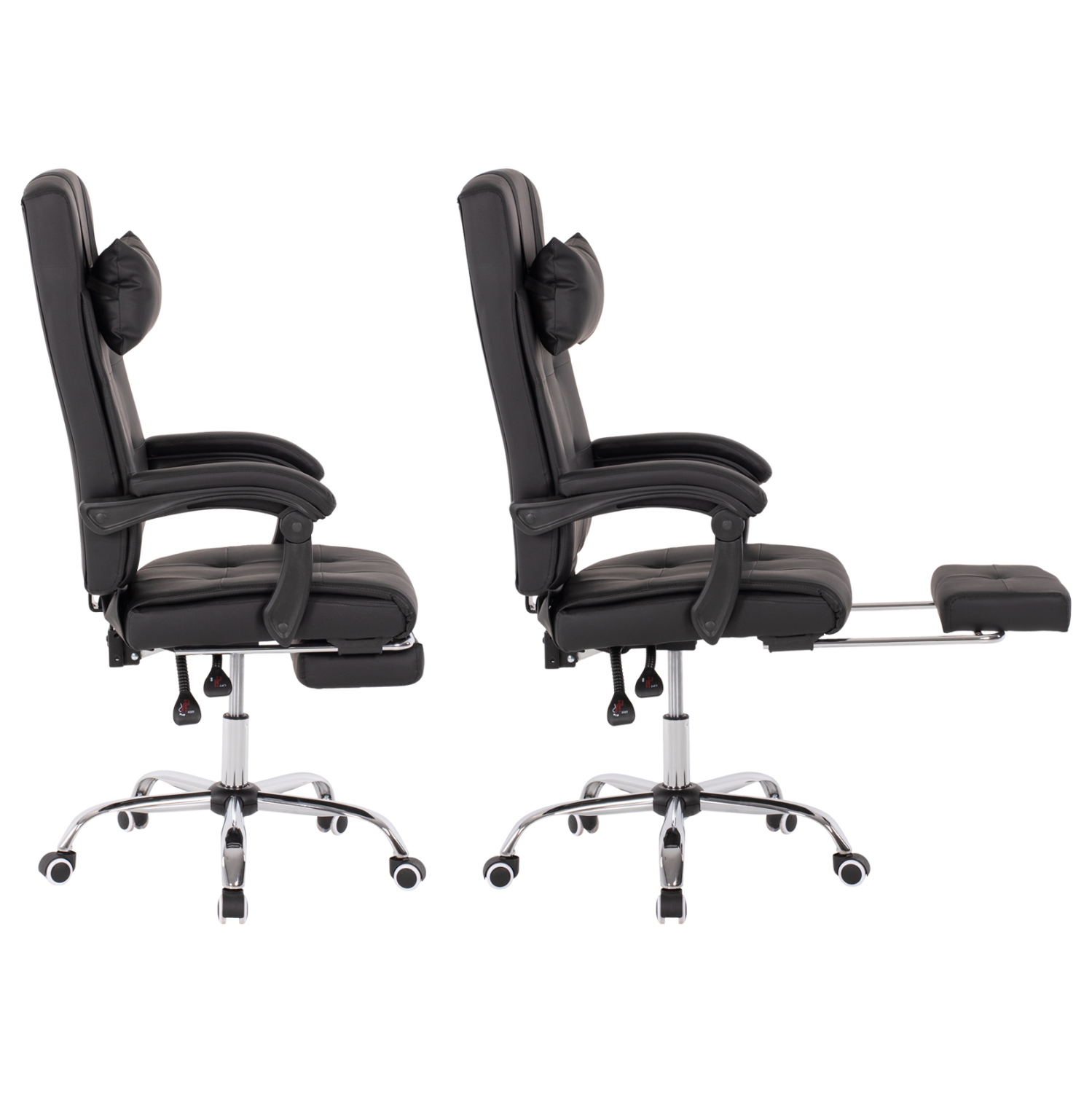 Διευθυντική καρέκλα γραφείου σε ΜΑΥΡΟ χρώμα. Μια «πλούσια» και επιβλητική καρέκλα γραφείου με αναπαυτικά μπράτσα με εργονομική κλίση επενδυμένα με μαξιλαράκια. Η πλάτη είναι πολύ ψηλή ενώ έχει πλούσια στρώση από αφρώδη υλικά και έξτρα μαξιλαράκι στο επάνω μέρος της πλάτης για μεγαλύτερη άνεση κατά την χρήση. Υποστηρίζει ολόκληρο τον κορμό σας, ενώ είναι επενδυμένη με υψηλής ποιότητας PU δέρμα με καπιτονέ τεχνοτροπία, όπως επίσης και το φαρδύ και αναπαυτικό κάθισμα με την εξτρά αναπαυτική επιφάνεια. Η βάση είναι χρωμιωμένη σε σχήμα «αστέρι» με κυρτά πόδια και ασπρόμαυρα ροδάκια. Το χαρακτηριστικό, όμως, που κάνει αυτή την καρέκλα να ξεχωρίζει είναι ότι διαθέτει πτυσσόμενο υποπόδιο, το οποίο σε συνδυασμό με το γεγονός ότι η πλάτη «πέφτει» με μεγάλη κλίση, σας επιτρέπει να ξαπλώνετε και να ξεκουράζεστε όταν το επιθυμείτε!