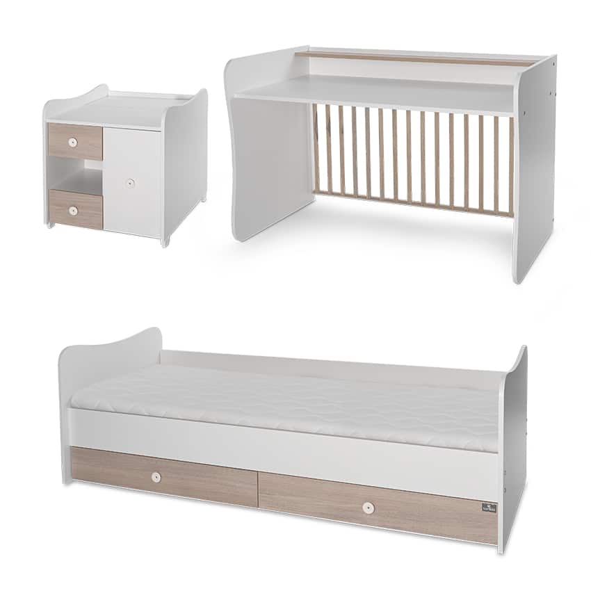 Όταν το παιδί μεγαλώσει, το κρεβάτι μετατρέπεται σε εφηβικό κρεβάτι με συρταριέρα και γραφείο.