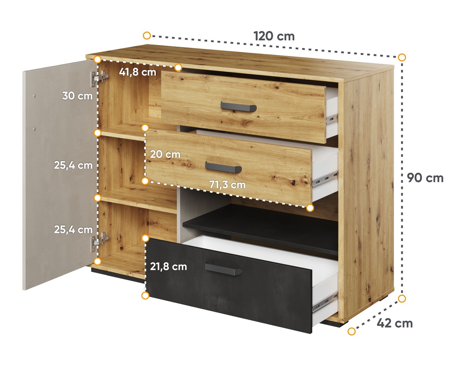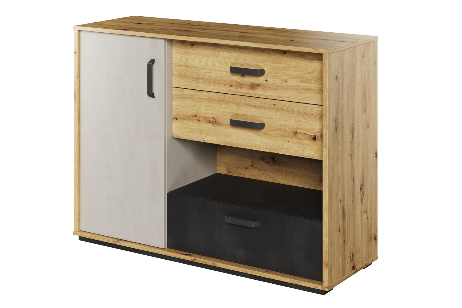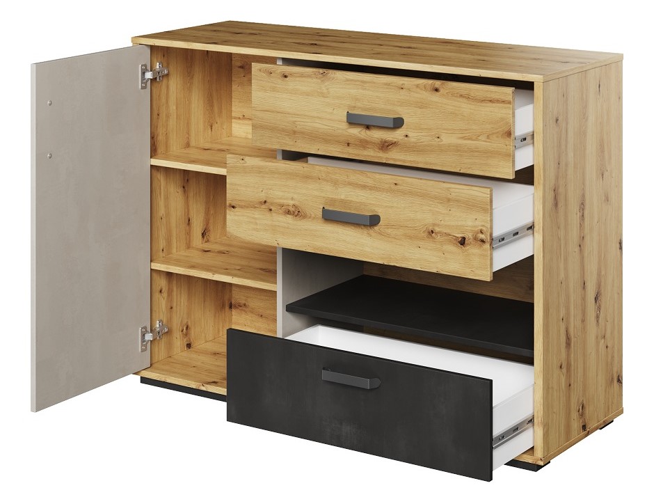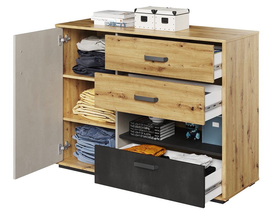 Μια μοντέρνα συρταριέρα με τρία συρτάρια για εσώρουχα και ένα ντουλάπι με πόρτες. Μια επιπλέον, εύκολα προσβάσιμη εσοχή είναι ένα καλό μέρος για μικρά αντικείμενα και σχολικά είδη.