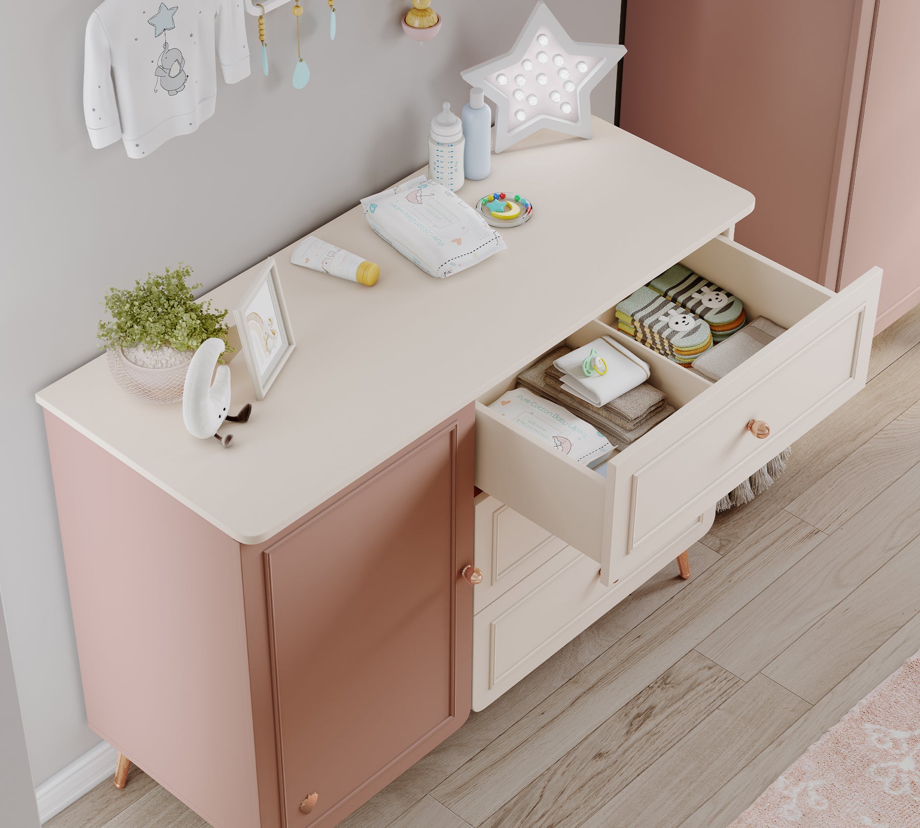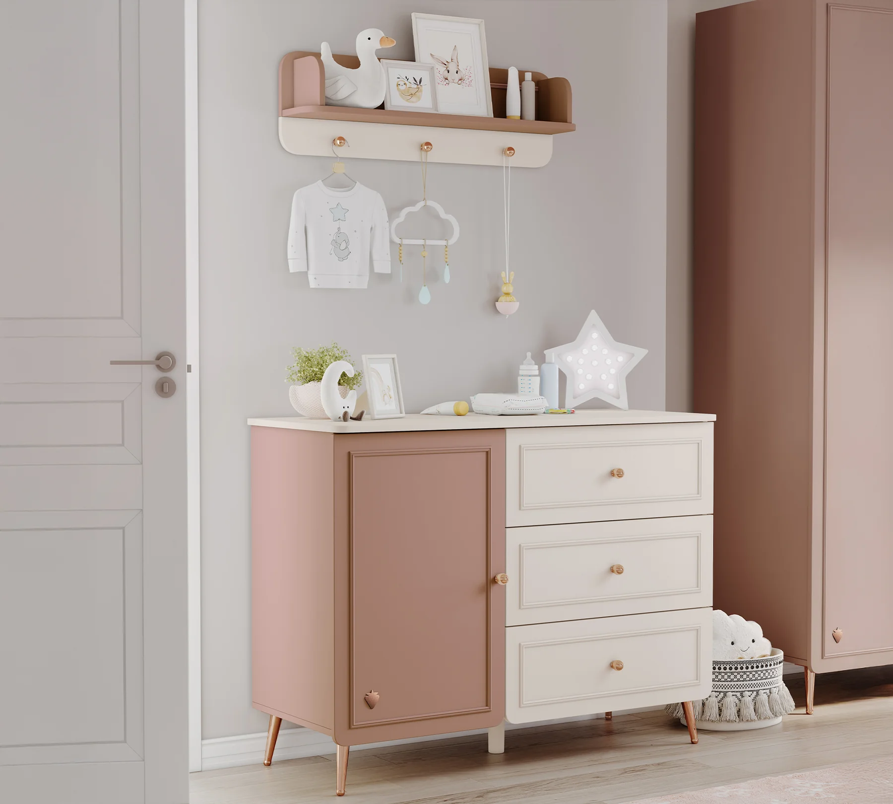 Η συρταριέρα της σειράς Elegance, αναδεικνύει την κομψότητα με τις λεπτομέρειες της επιφάνειας Rossette και Vison Cream, επιτρέπει να αποθηκεύετε τα πράγματα του μωρού σας με τάξη τόσο στο ντουλάπι όσο και στα συρτάρια. Τα συρτάρια ανοίγουν και κλείνουν αθόρυβα και εύκολα με τη δυνατότητα αυτοφρεναρίσματος ράγας, ενώ προσφέρουν επίσης ασφαλή χρήση έναντι πιθανών ατυχημάτων/εμπλοκών.