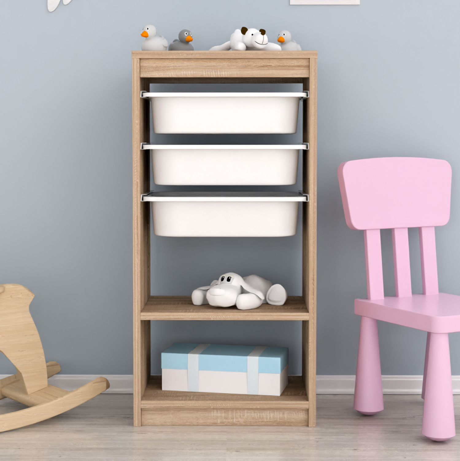 Η SANI είναι μια συρταριέρα με πλαίσιο από μελαμίνη σε χρώμα SONAMA, και 3 ΛΕΥΚΑ συρτάρια από πολυαιθυλένιο (πλαστικό). Κάτω από τα συρτάρια υπάρχει ένα ανοιχτό ράφι. Ιδανική συρταριέρα για την καλύτερη οργάνωση του παιδικού δωματίου.