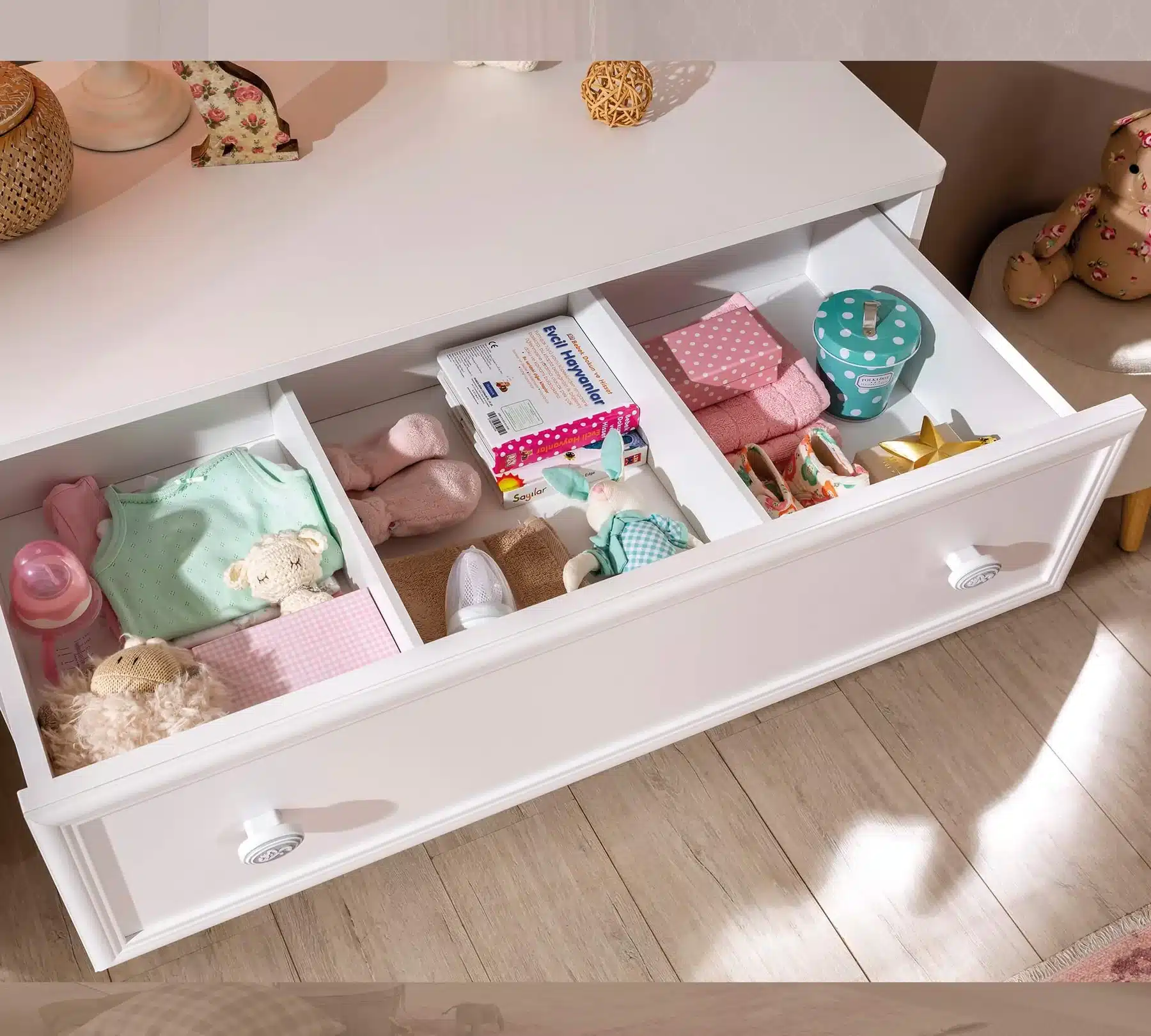 Η παιδική συρταριέρα για κορίτσι λευκή ROMANTIC με 3 συρτάρια διαθέτει τρία μεγάλα και ευρύχωρα συρτάρια που προσφέρουν άνετο αποθηκευτικό χώρο για ρούχα, αξεσουάρ ή άλλα προσωπικά αντικείμενα του παιδιού. Με αυτόν τον τρόπο βοηθά στη σωστή οργάνωση του δωματίου και διατηρεί τον χώρο τακτοποιημένο.