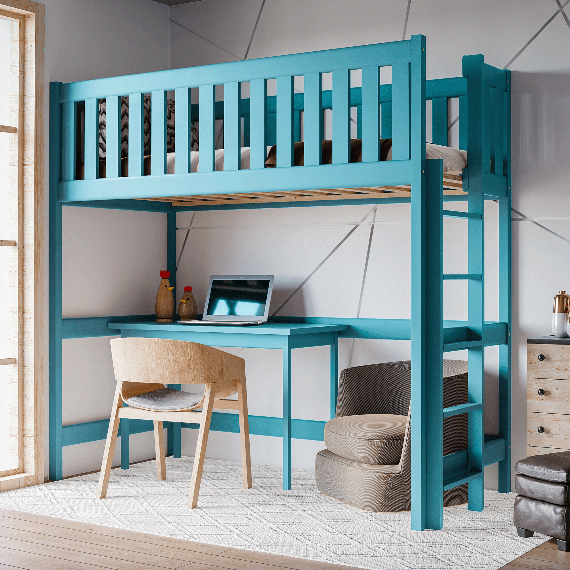 Υπερυψωμένο Κρεβάτι Leon με Πλαϊνή Σκάλα από μασίφ ξύλο Blue 90×200cm (Δώρο 10% Έκπτωση στo Στρώμα)