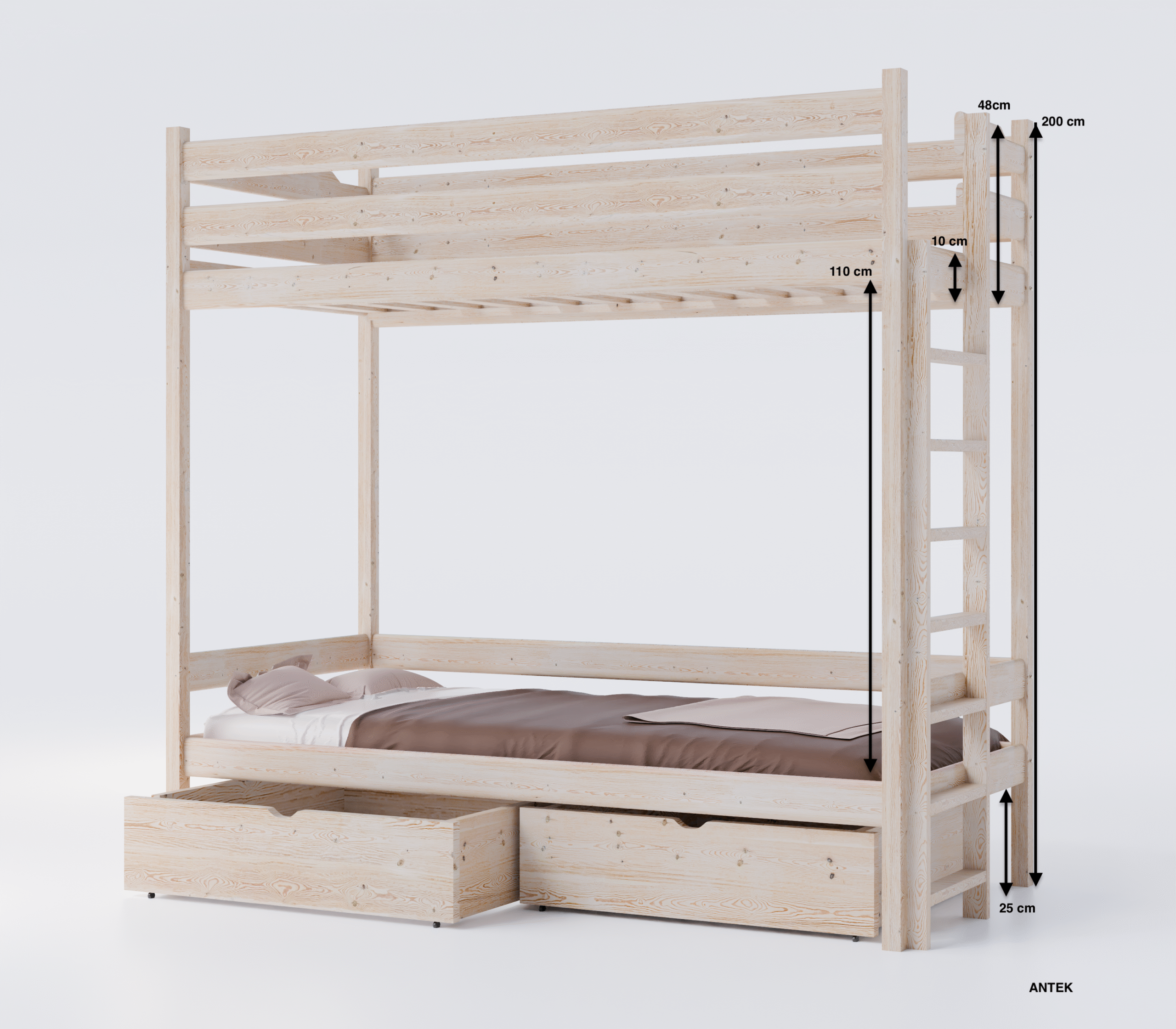 Παράλληλα, μπορείτε να επιλέξετε διαστάσεις που προσαρμόζονται απόλυτα στον χώρο σας. Έτσι, η κουκέτα Antek από μασίφ ξύλο πεύκου με συρτάρια καλύπτει διαφορετικές ανάγκες, είτε πρόκειται για μικρά είτε για μεγαλύτερα παιδικά δωμάτια.