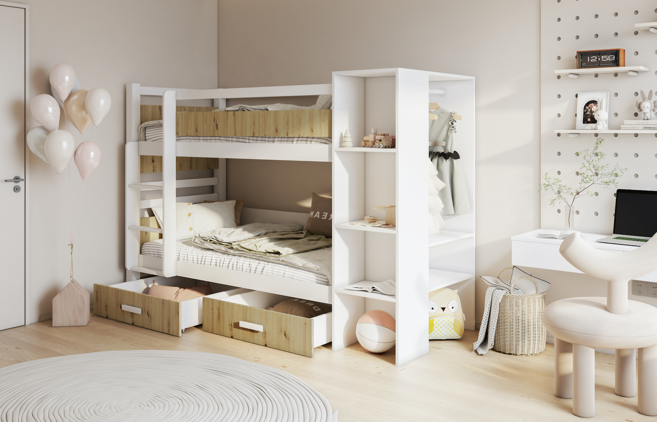 Η κουκέτα ενσωματώνει βιβλιοθήκη, η οποία προσφέρει εύκολη πρόσβαση σε βιβλία και αντικείμενα, ενώ ταυτόχρονα οργανώνει τον χώρο. Επιπλέον, διαθέτει δύο ευρύχωρα συρτάρια με ρόδες, ώστε να αποθηκεύετε άνετα κλινοσκεπάσματα, παιχνίδια ή άλλα απαραίτητα είδη, διατηρώντας το δωμάτιο πάντα τακτοποιημένο.