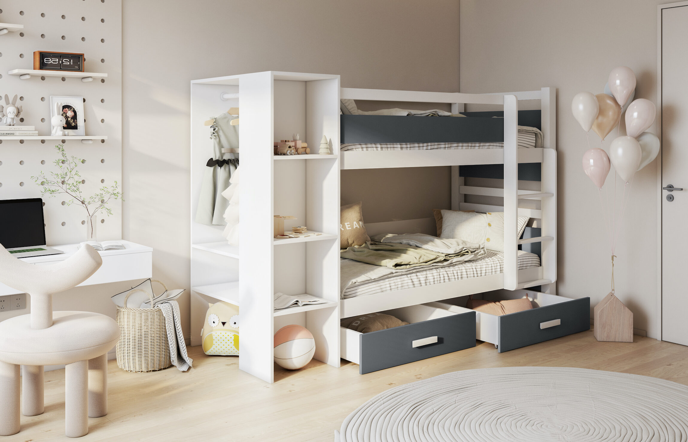Η κουκέτα Apollo συνδυάζει βιβλιοθήκη και συρτάρια αποθήκευσης, ώστε να οργανώνετε το παιδικό δωμάτιο εύκολα και να εξοικονομείτε χώρο.