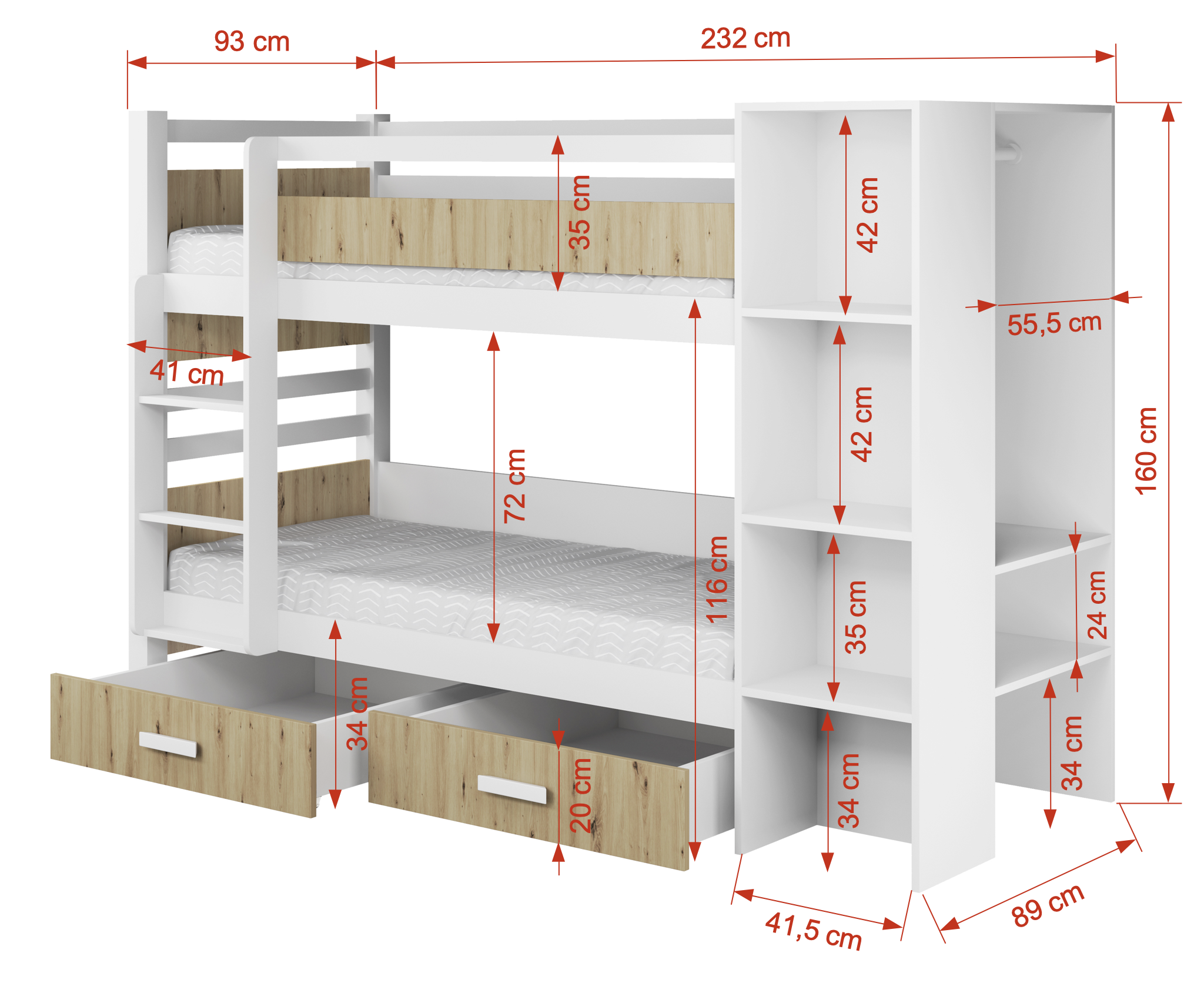 Η χρήση ξύλινων στοιχείων (χρώμα bialy) καθιστά αυτό το μοντέλο ασφαλέστερο για χρήση από παιδιά και ενήλικες. Επιπλέον, η χρήση μοριοσανίδας (χρώμα Artisan Oak) ως προσθήκη στο πλαίσιο μας επιτρέπει περισσότερες επιλογές για την αντιστοίχιση της κουκέτας με τα υπάρχοντα έπιπλα στο παιδικό δωμάτιο. Η βιβλιοθήκη είναι κατασκευασμένη από μοριοσανίδα.