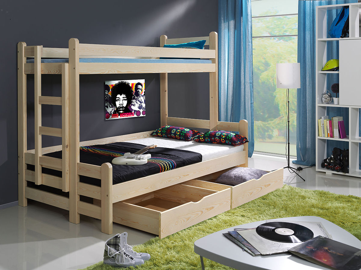 Επιπλέον, η κουκέτα Beniamin για τρία παιδιά διαθέτει δύο πρακτικά συρτάρια αποθήκευσης, ώστε να οργανώνετε προσωπικά αντικείμενα, παιχνίδια ή κλινοσκεπάσματα χωρίς κόπο. Έτσι, το παιδικό δωμάτιο παραμένει τακτοποιημένο και λειτουργικό.