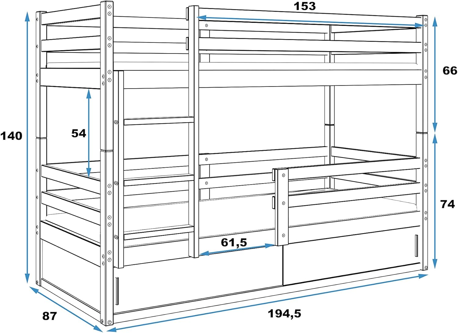 - Εξωτερική Διάσταση Κουκέτας: Μήκος 194,5cm x Πλάτος 87cm x Ύψος 140cm