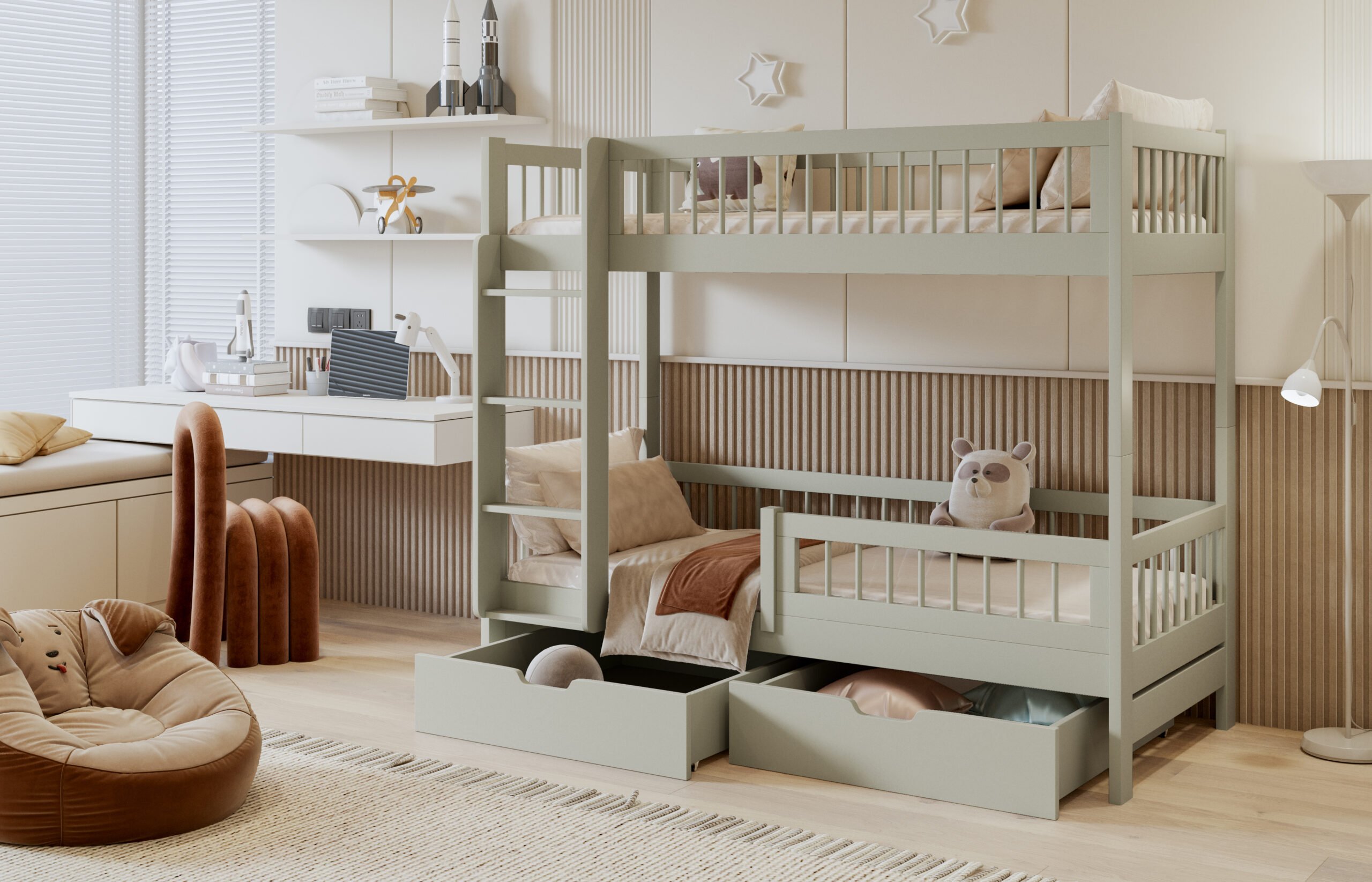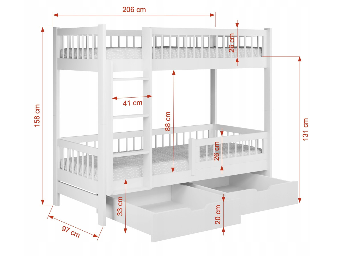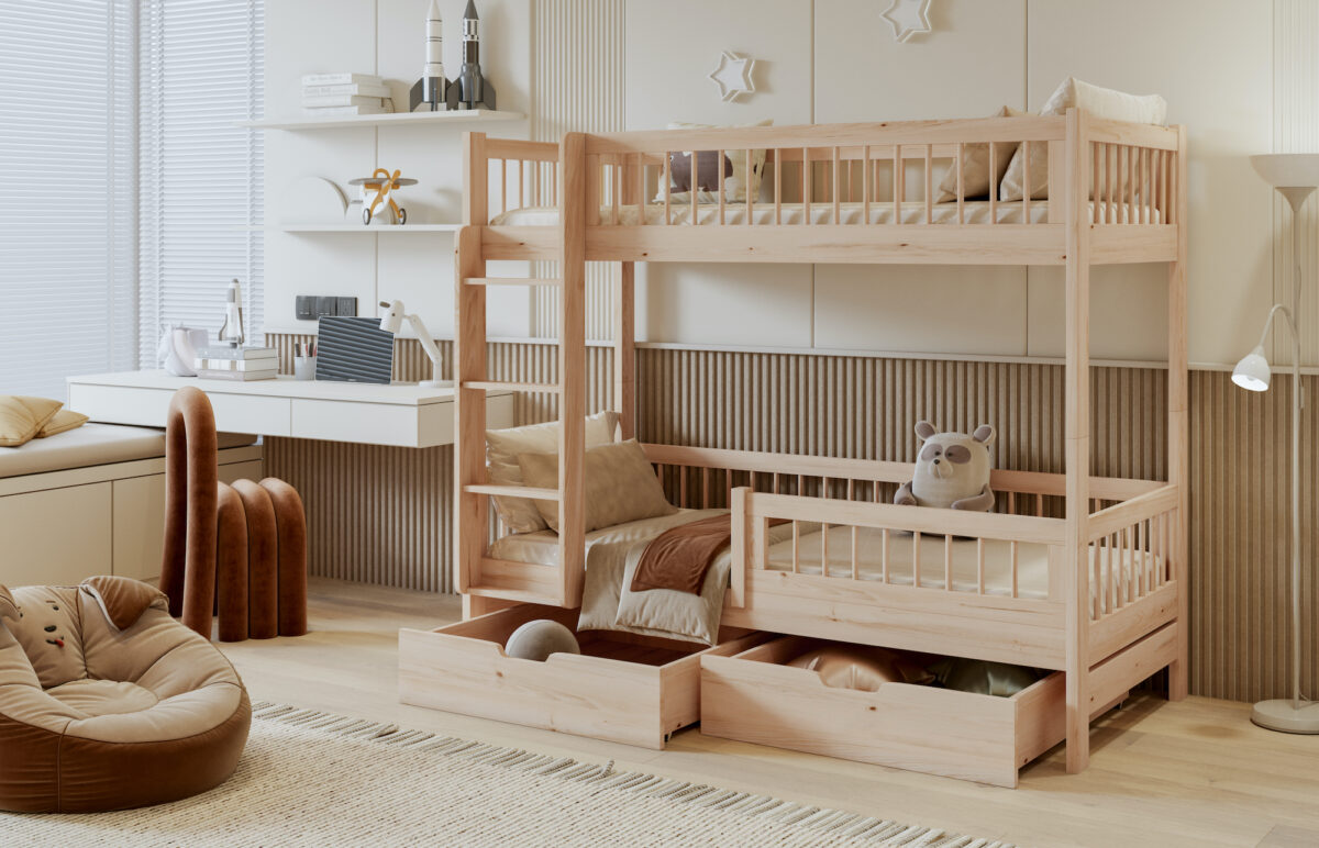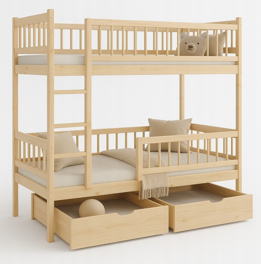 Ταυτόχρονα, η κουκέτα περιλαμβάνει δύο ευρύχωρα συρτάρια, ώστε να αποθηκεύετε εύκολα κλινοσκεπάσματα, παιχνίδια και καθημερινά αντικείμενα. Με αυτόν τον τρόπο, το παιδικό δωμάτιο παραμένει οργανωμένο και λειτουργικό.