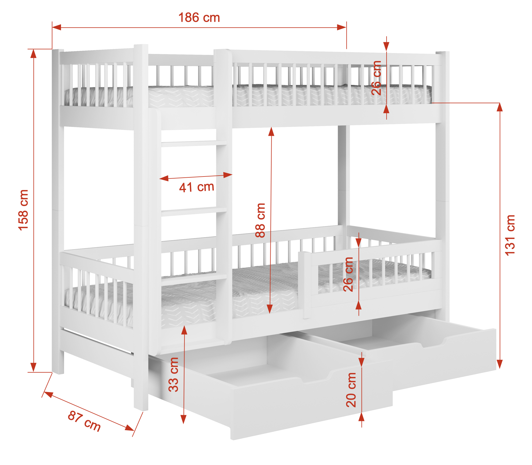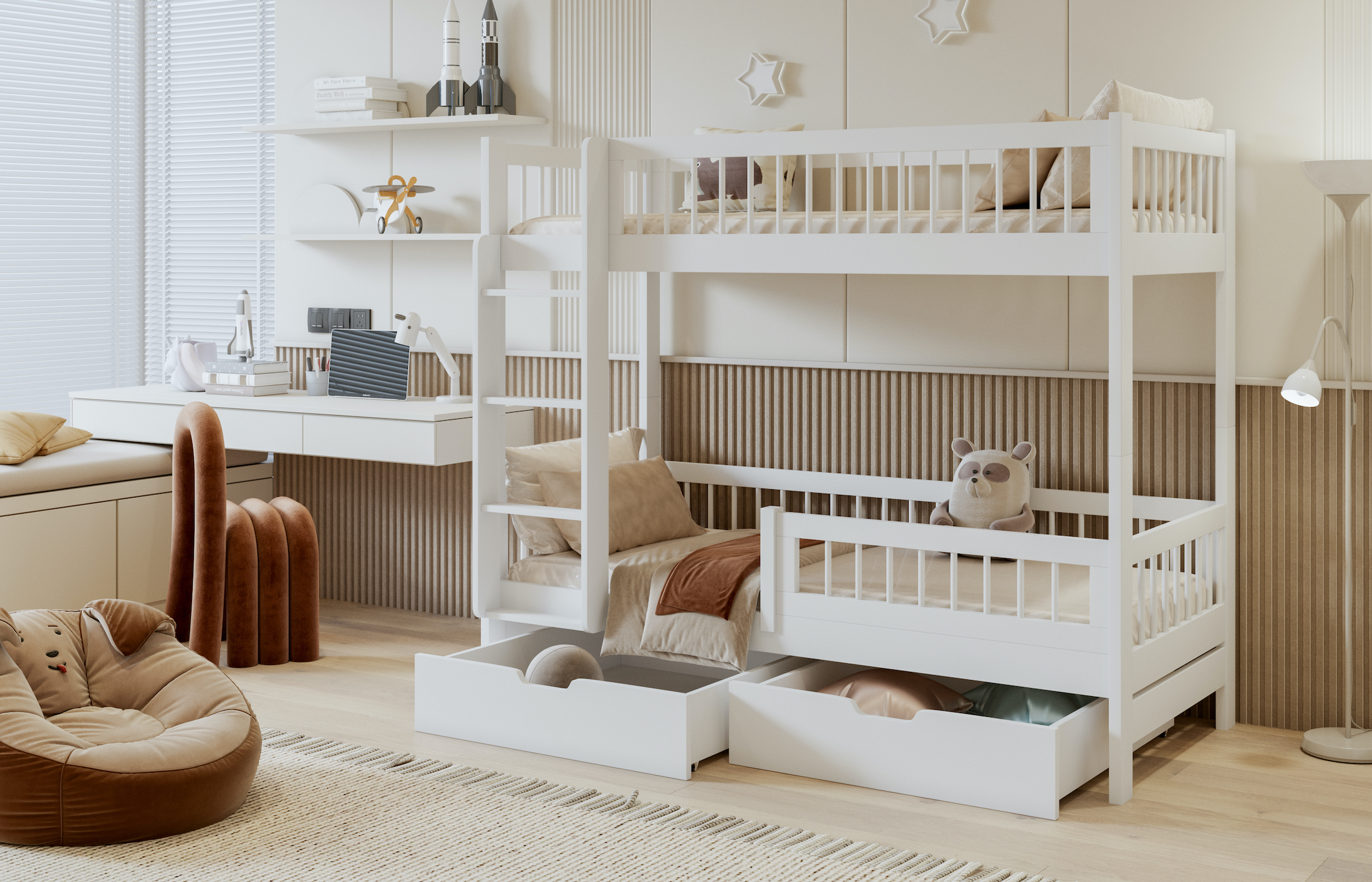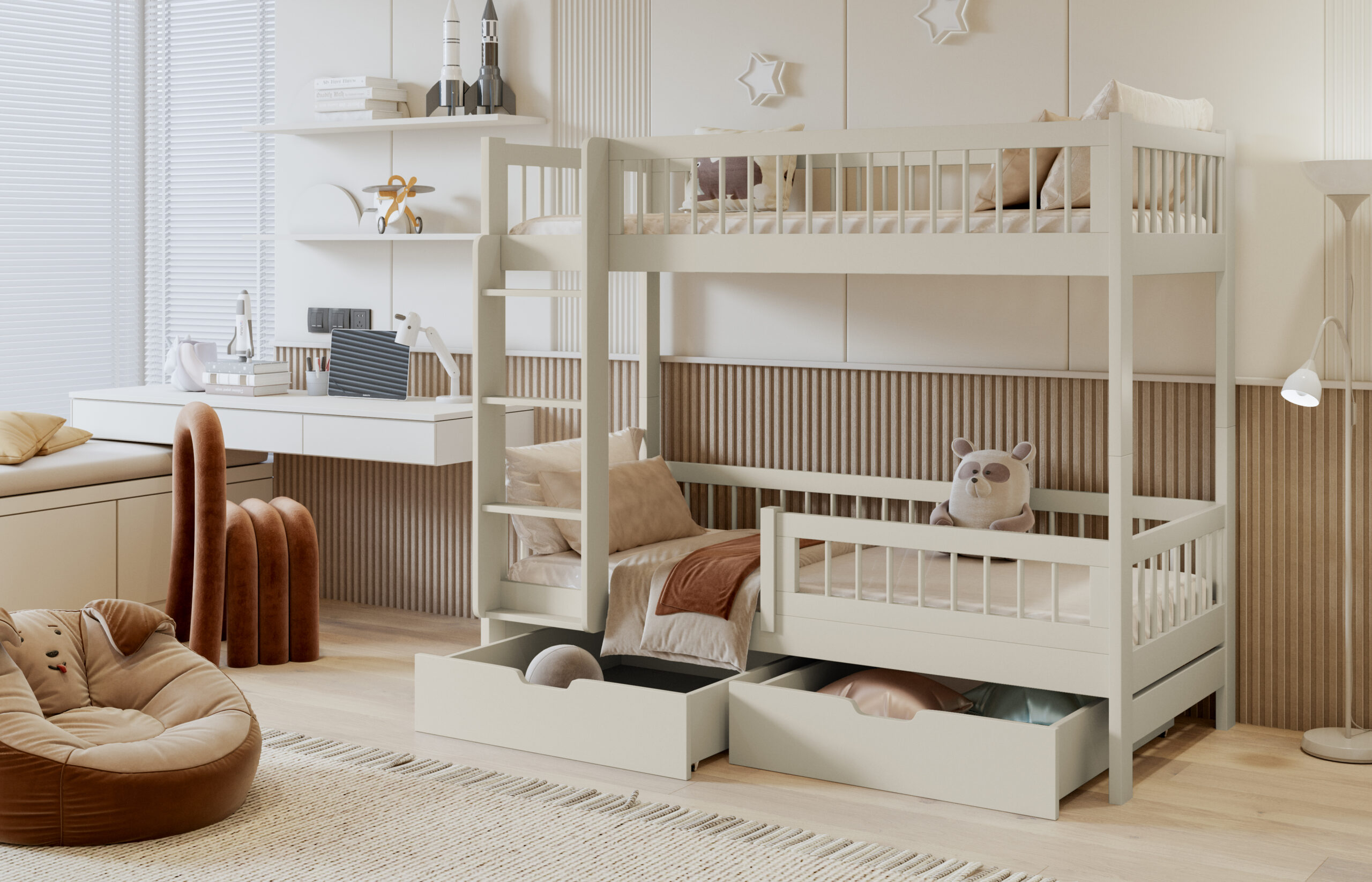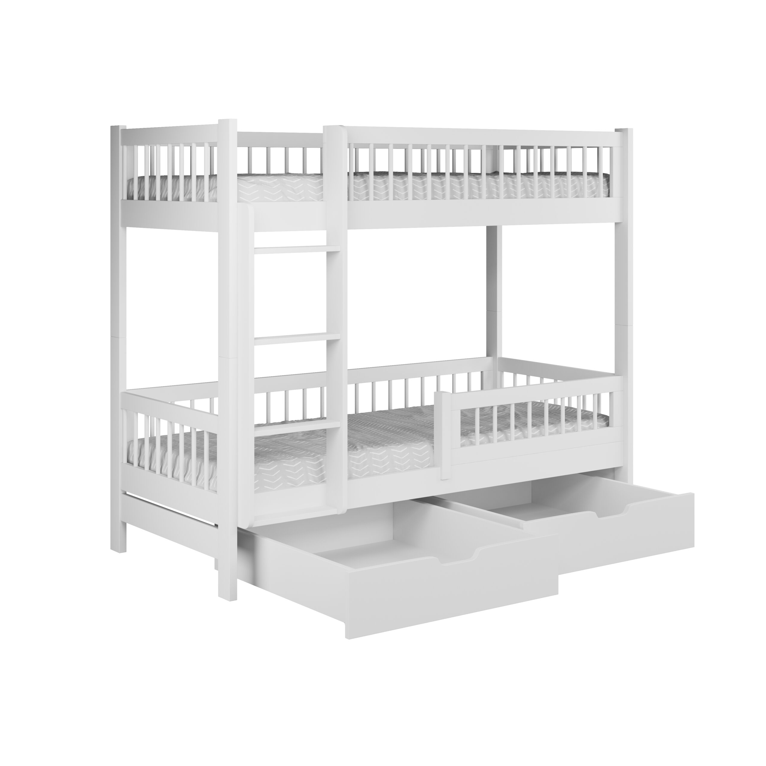 Ταυτόχρονα, η κουκέτα περιλαμβάνει δύο ευρύχωρα συρτάρια, ώστε να αποθηκεύετε εύκολα κλινοσκεπάσματα, παιχνίδια και καθημερινά αντικείμενα. Με αυτόν τον τρόπο, το παιδικό δωμάτιο παραμένει οργανωμένο και λειτουργικό.