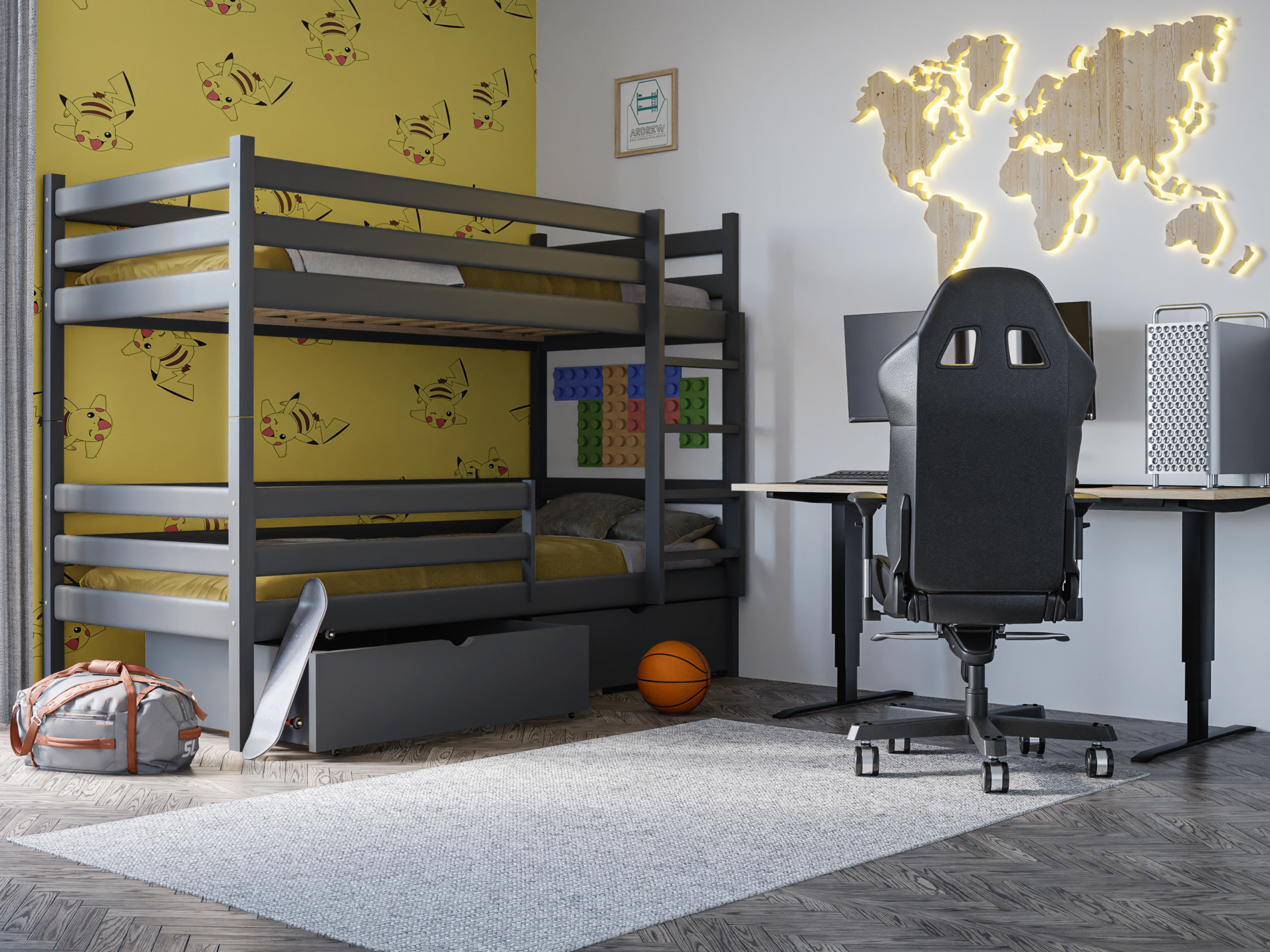 Η κουκέτα Dawid Graphite με συρτάρια προσφέρει άνετο και ασφαλή ύπνο για δύο παιδιά, ενώ παράλληλα βοηθά να οργανώσετε καλύτερα τον χώρο χάρη στους πρακτικούς αποθηκευτικούς χώρους. Έτσι, διατηρείτε το παιδικό δωμάτιο τακτοποιημένο και λειτουργικό.