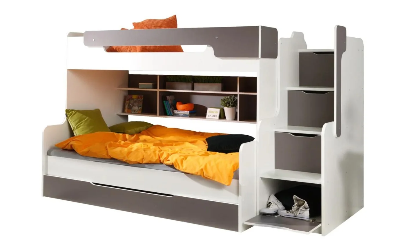 Η κουκέτα Harry με σκάλα αποθήκευσης αποτελεί ιδανική λύση για οικογένειες με τρία ή τέσσερα παιδιά, καθώς συνδυάζει άνετο ύπνο, έξυπνη οργάνωση και σύγχρονο σχεδιασμό. Παράλληλα, αξιοποιεί στο έπακρο τον διαθέσιμο χώρο, χωρίς να περιορίζει την άνεση των παιδιών.