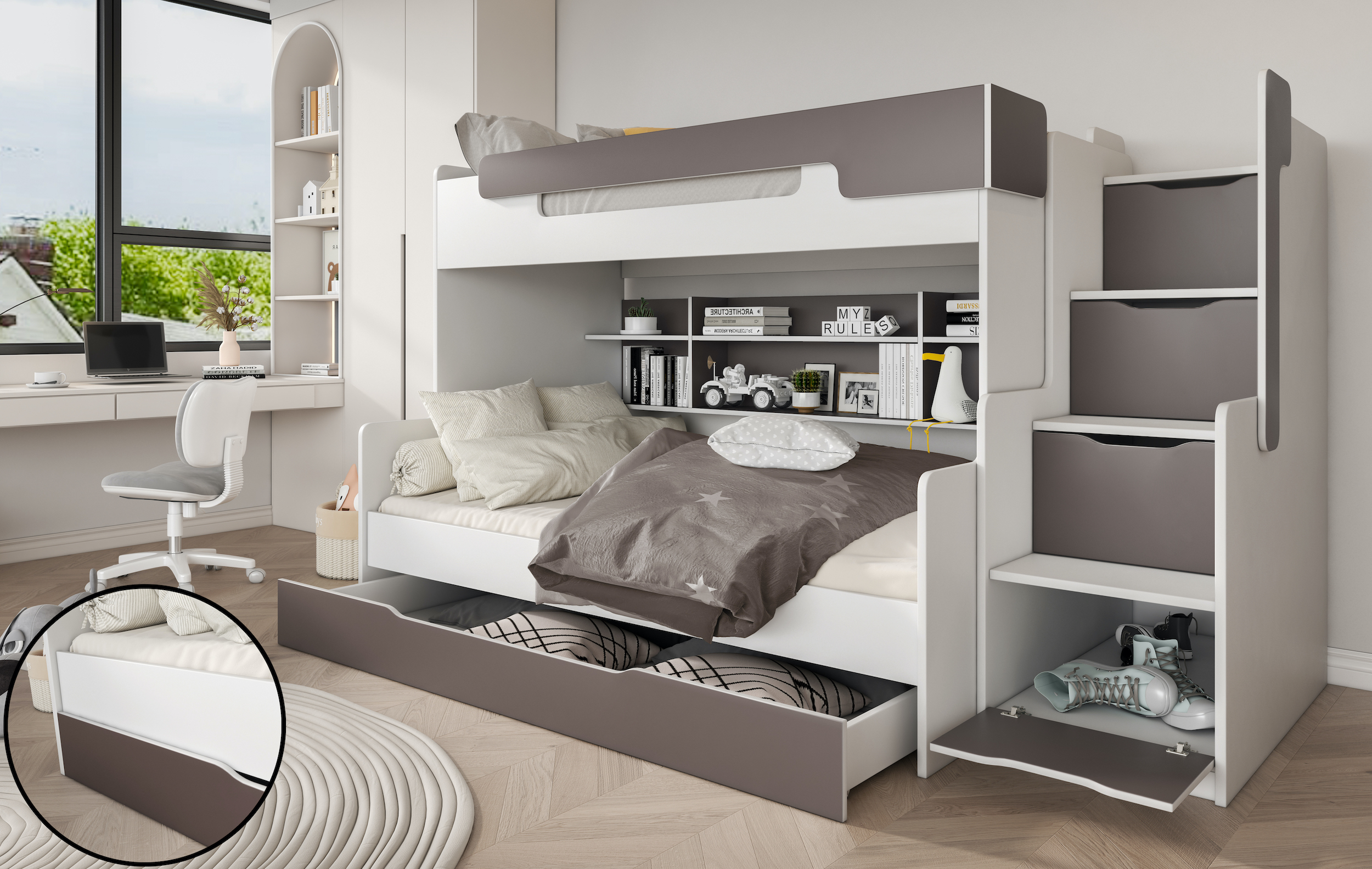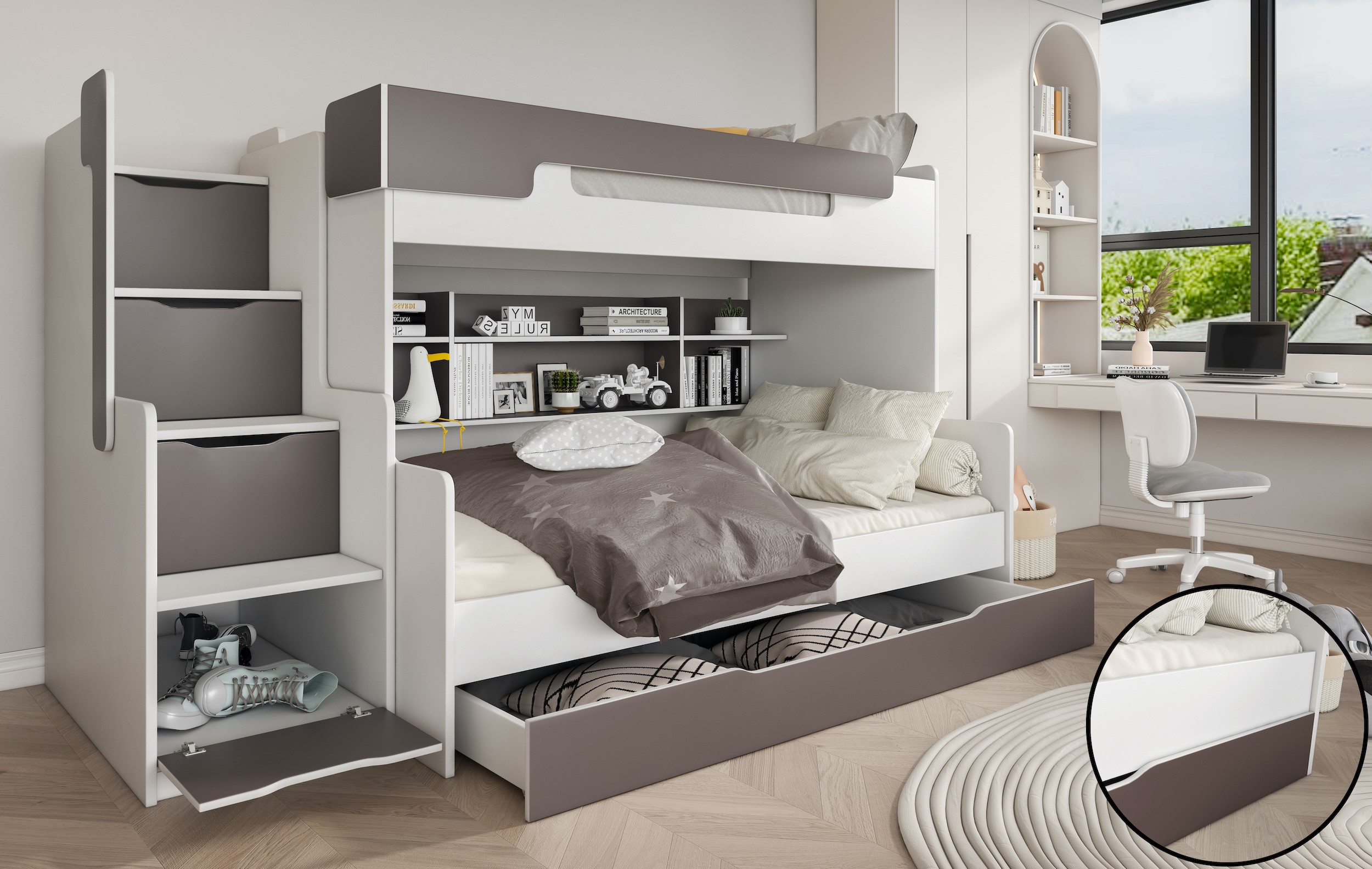 Ένα από τα βασικά χαρακτηριστικά που ξεχωρίζουν είναι η σκάλα με ενσωματωμένα συρτάρια αποθήκευσης. Η σκάλα προσφέρει ασφαλή και άνετη αναρρίχηση, ενώ κάθε σκαλοπάτι ανοίγει ως συρτάρι, δημιουργώντας πρακτικό χώρο για ρούχα, παιχνίδια, παπούτσια ή αξεσουάρ. Παράλληλα, το ντουλάπι στο κάτω μέρος της σκάλας προσθέτει ακόμη περισσότερο αποθηκευτικό χώρο.