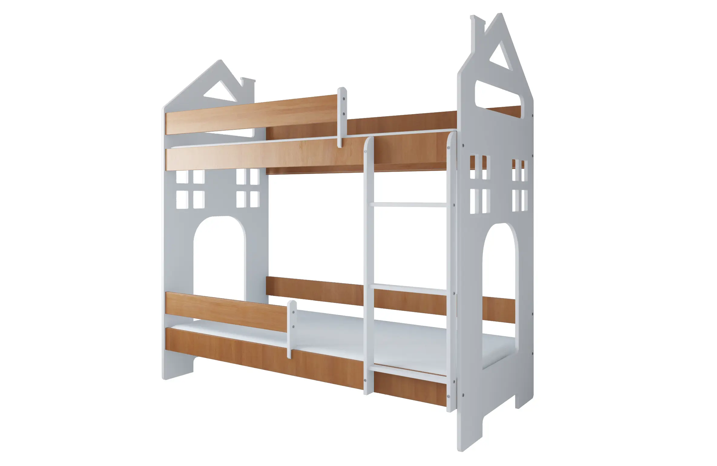 Επιπλέον, η κουκέτα House αποτελείται από δύο άνετα κρεβάτια, κατάλληλα για στρώματα διαστάσεων 80 × 180 cm, εξασφαλίζοντας ξεκούραστο και ασφαλή ύπνο. Ταυτόχρονα, η σκάλα εφαρμόζει σταθερά και με απόλυτη ασφάλεια πάνω στον σκελετό, διευκολύνοντας την καθημερινή χρήση και ενισχύοντας τη σταθερότητα της κατασκευής.