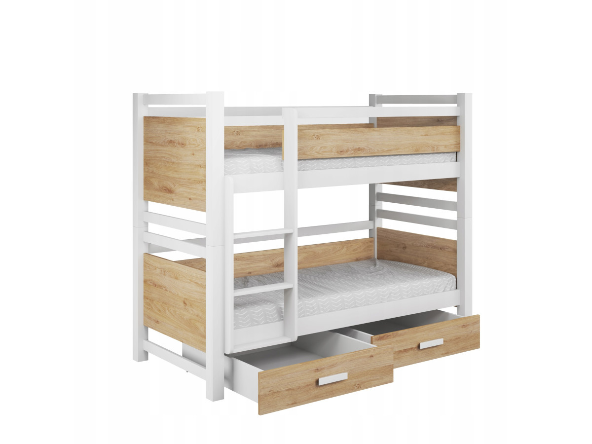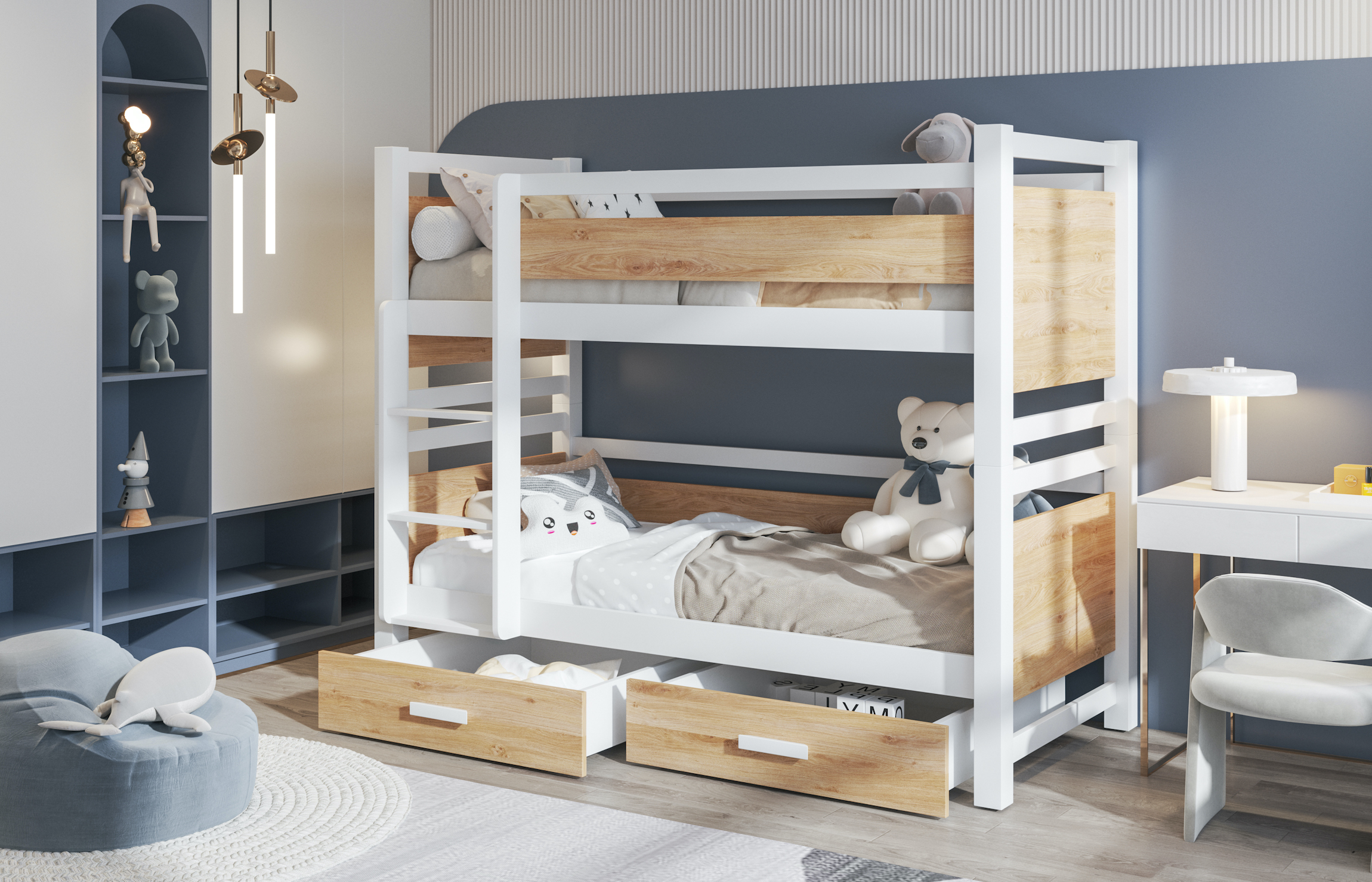 Επιπλέον, η κουκέτα περιλαμβάνει δύο ευρύχωρα συρτάρια, ώστε να αποθηκεύετε εύκολα κλινοσκεπάσματα, παιχνίδια ή άλλα απαραίτητα αντικείμενα. Έτσι, διατηρείτε το δωμάτιο οργανωμένο, ενώ ταυτόχρονα αξιοποιείτε κάθε διαθέσιμο σημείο.