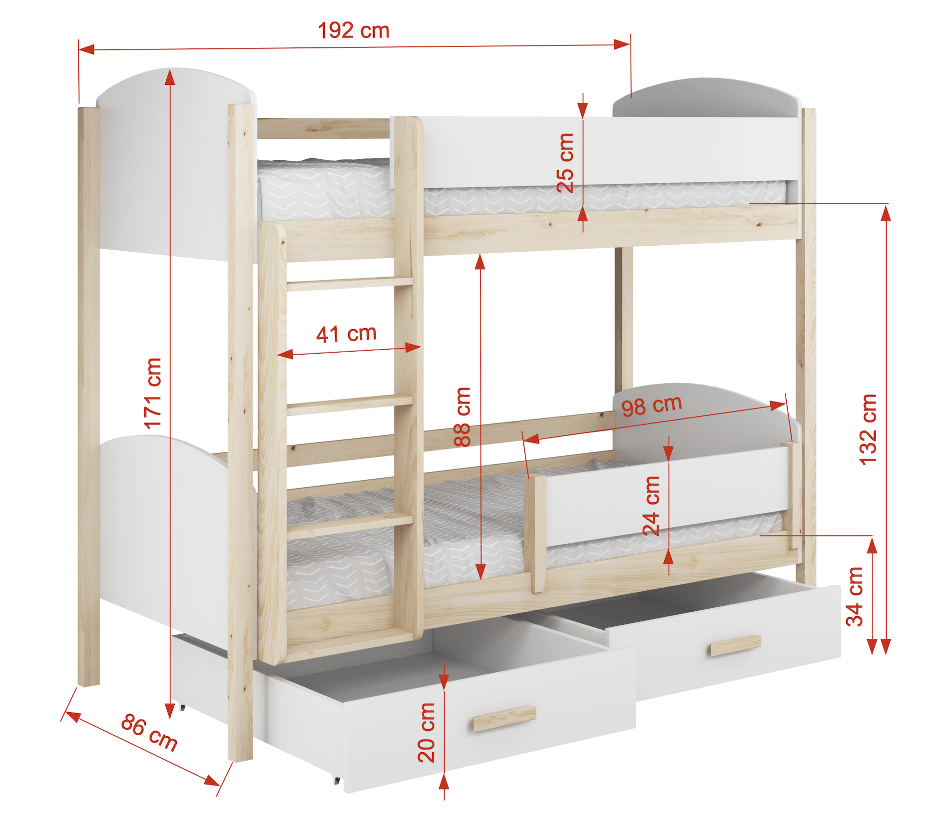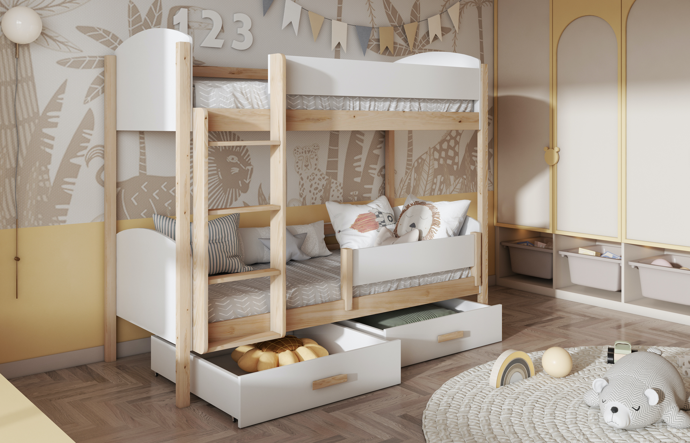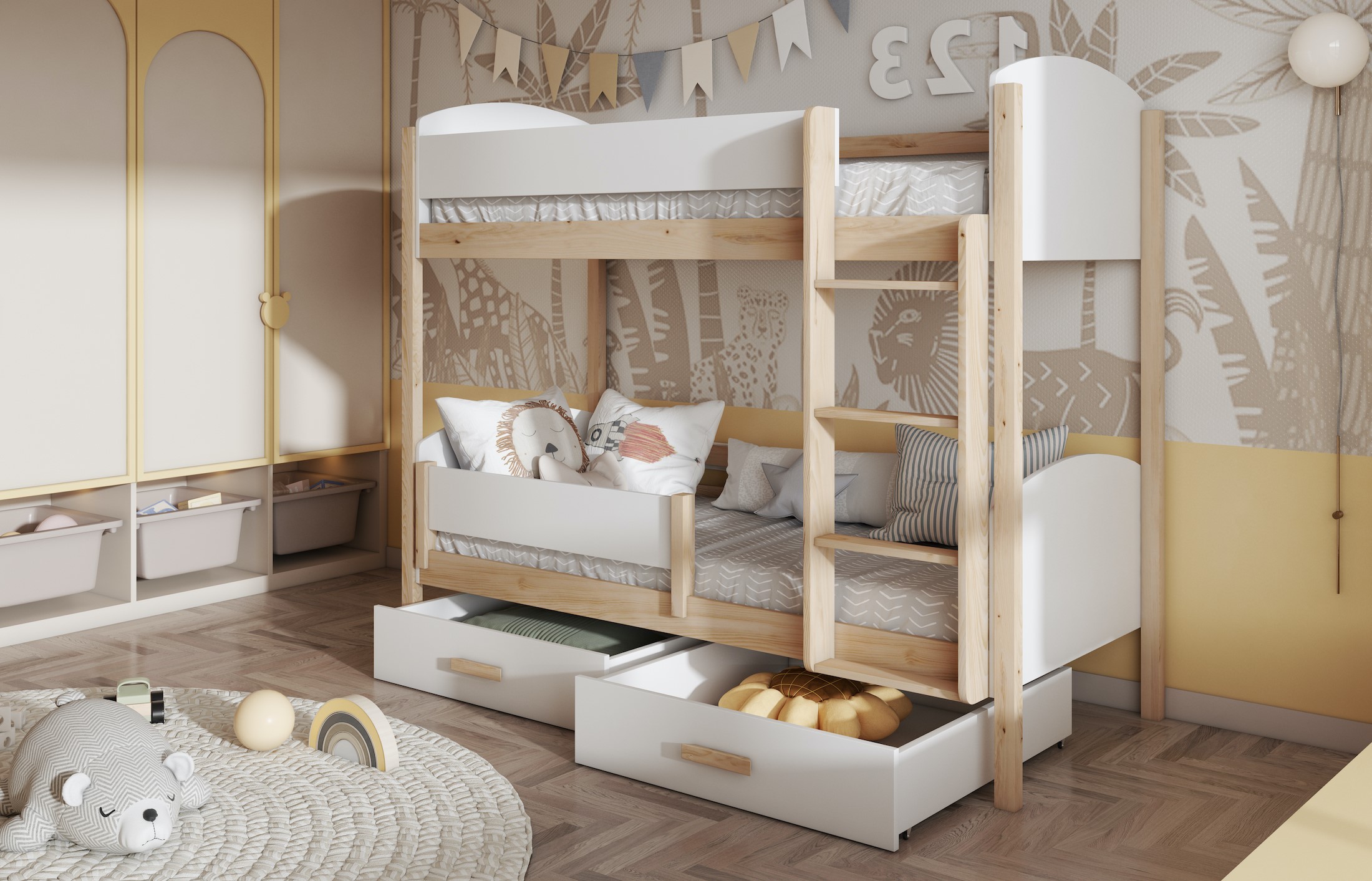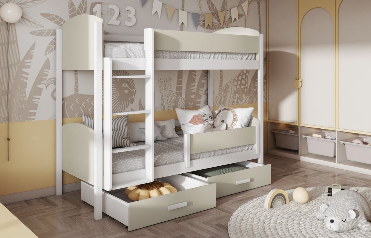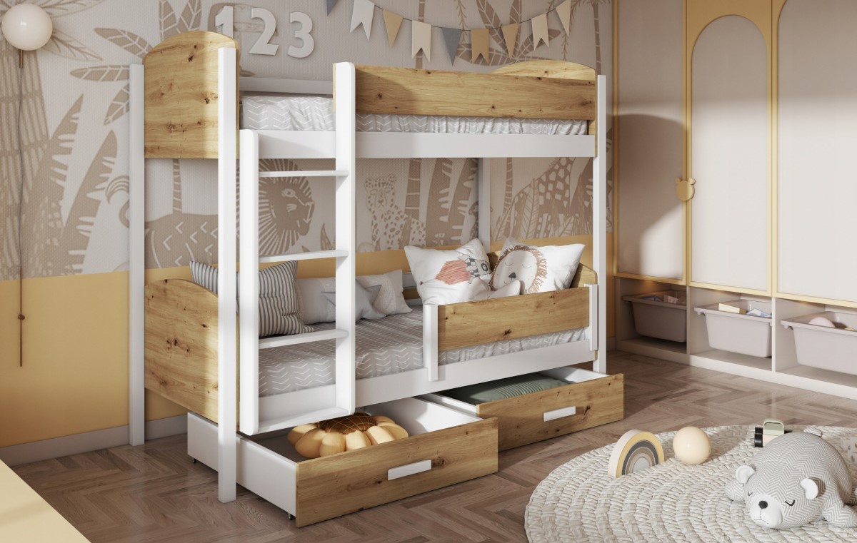 Ταυτόχρονα, η κουκέτα περιλαμβάνει δύο ευρύχωρα συρτάρια, ώστε να αποθηκεύετε εύκολα κλινοσκεπάσματα, παιχνίδια ή άλλα απαραίτητα αντικείμενα. Με αυτόν τον τρόπο, το παιδικό δωμάτιο παραμένει οργανωμένο και λειτουργικό.