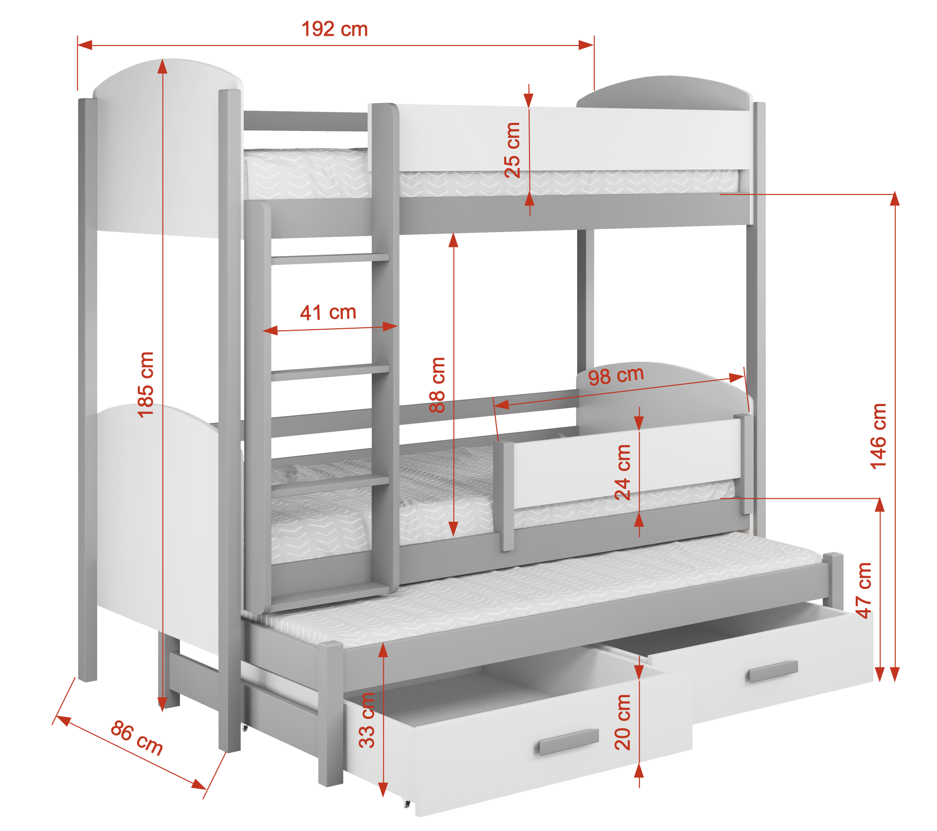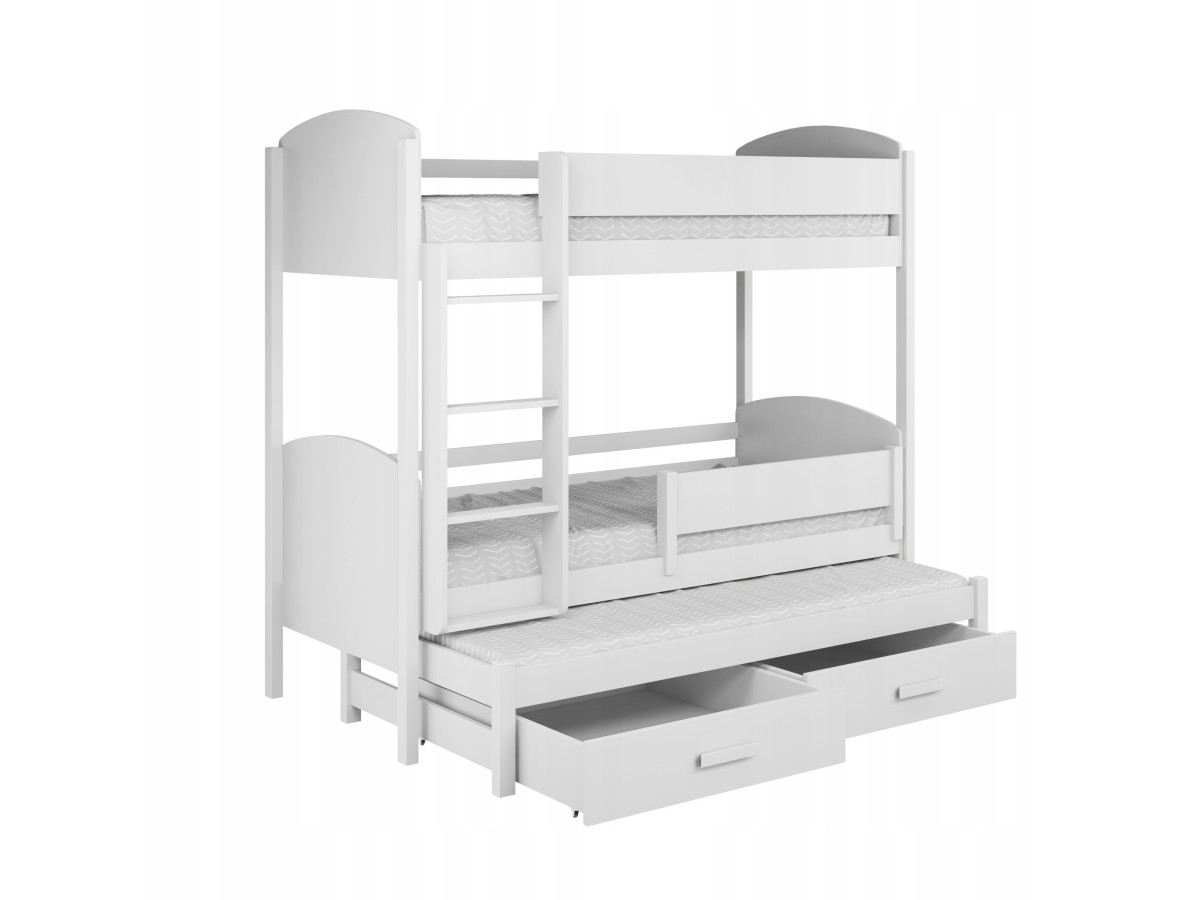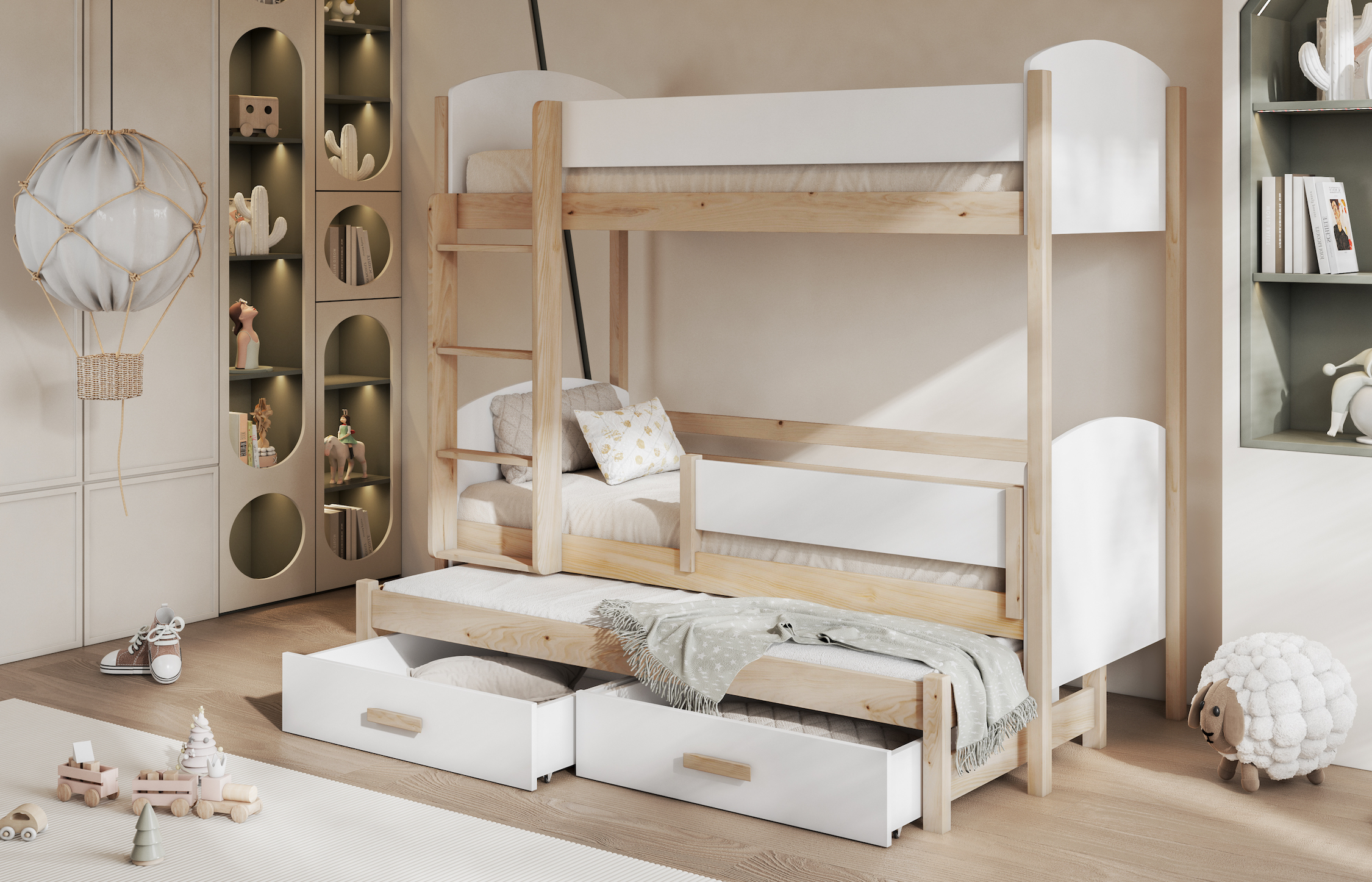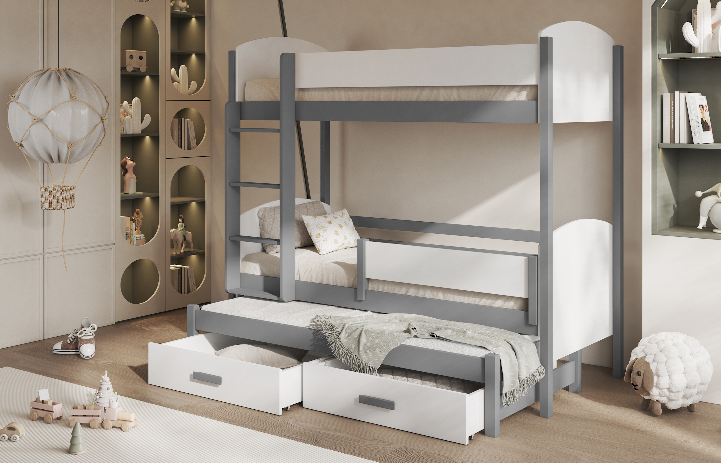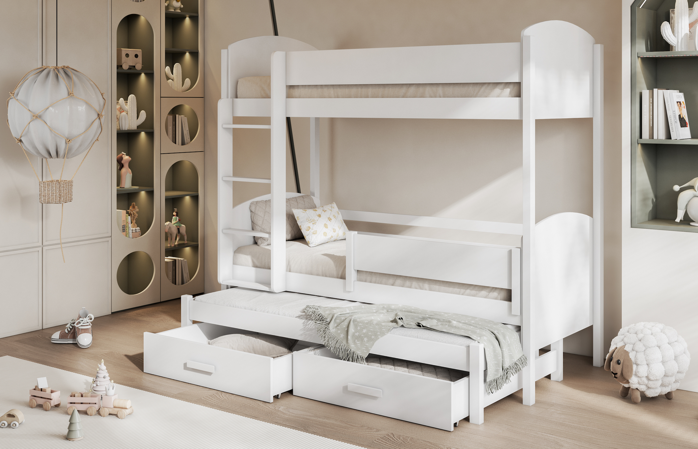 Η κουκέτα LOGAN για τρία παιδιά αποτελεί μία έξυπνη και πρακτική λύση για οικογένειες που θέλουν να φιλοξενήσουν περισσότερα παιδιά στο ίδιο δωμάτιο, καθώς διαθέτει τρίτο συρόμενο κρεβάτι και δύο ευρύχωρα συρτάρια. Παράλληλα, βοηθά στην καλύτερη οργάνωση του χώρου, ώστε το παιδικό δωμάτιο να παραμένει λειτουργικό και τακτοποιημένο.