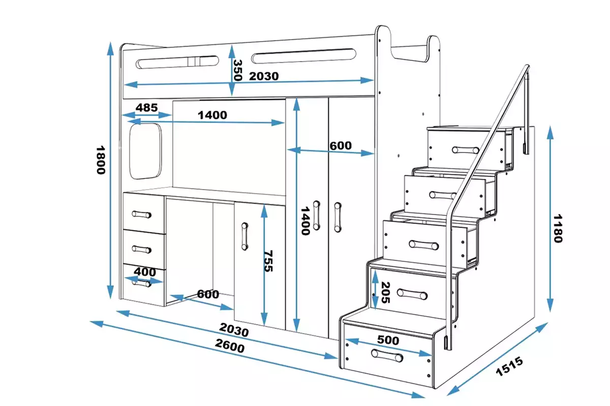 - Εξωτερική Διάσταση Κουκέτας: Μήκος 258cm x Πλάτος 152cm x Ύψος 180cm