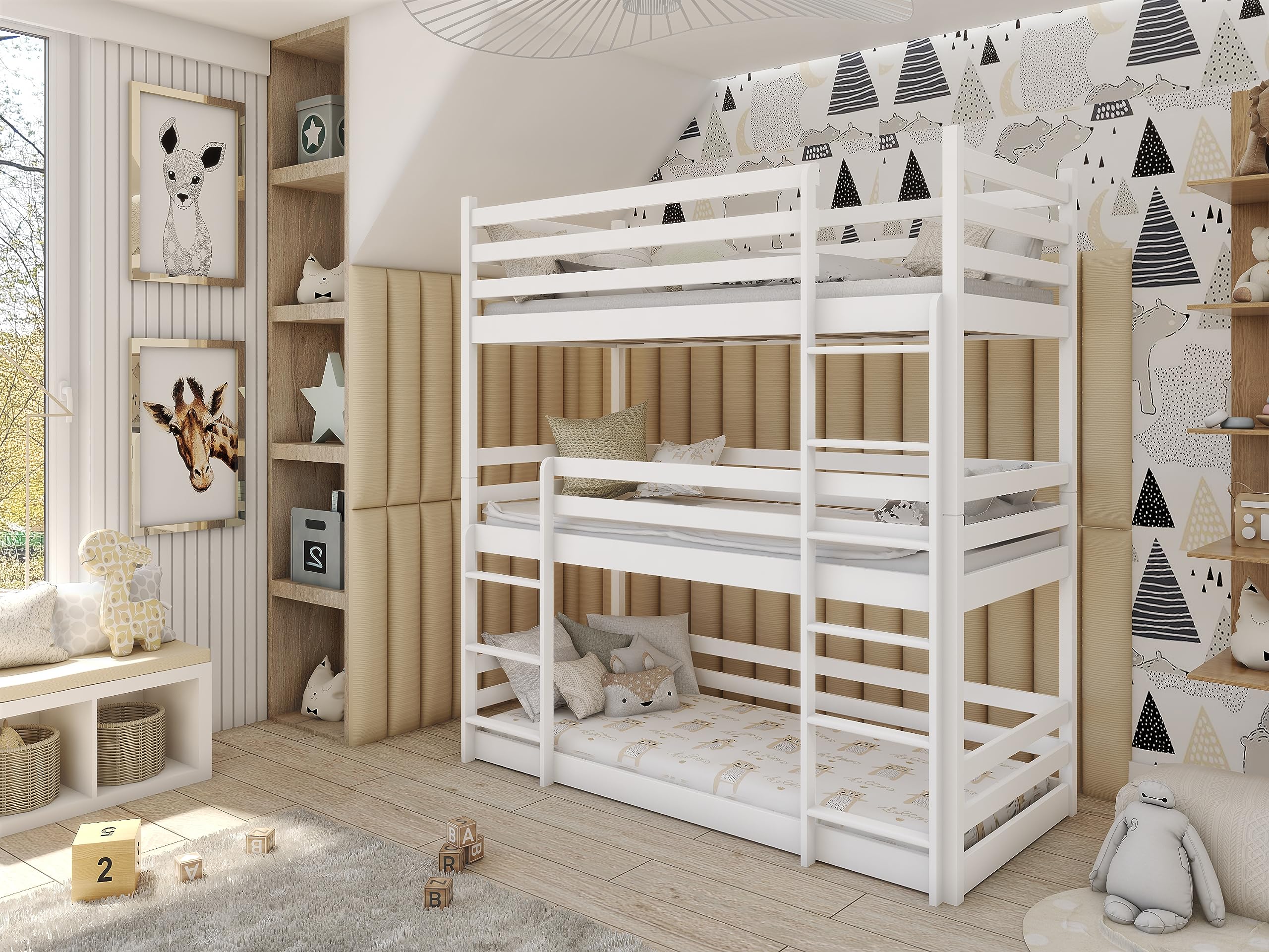 Κουκέτα Παιδική Montessori Τριώροφη Ted με κάγκελα 38cm από μασίφ ξύλο White 90×200cm (Δώρο 10% Έκπτωση στα Στρώματα)