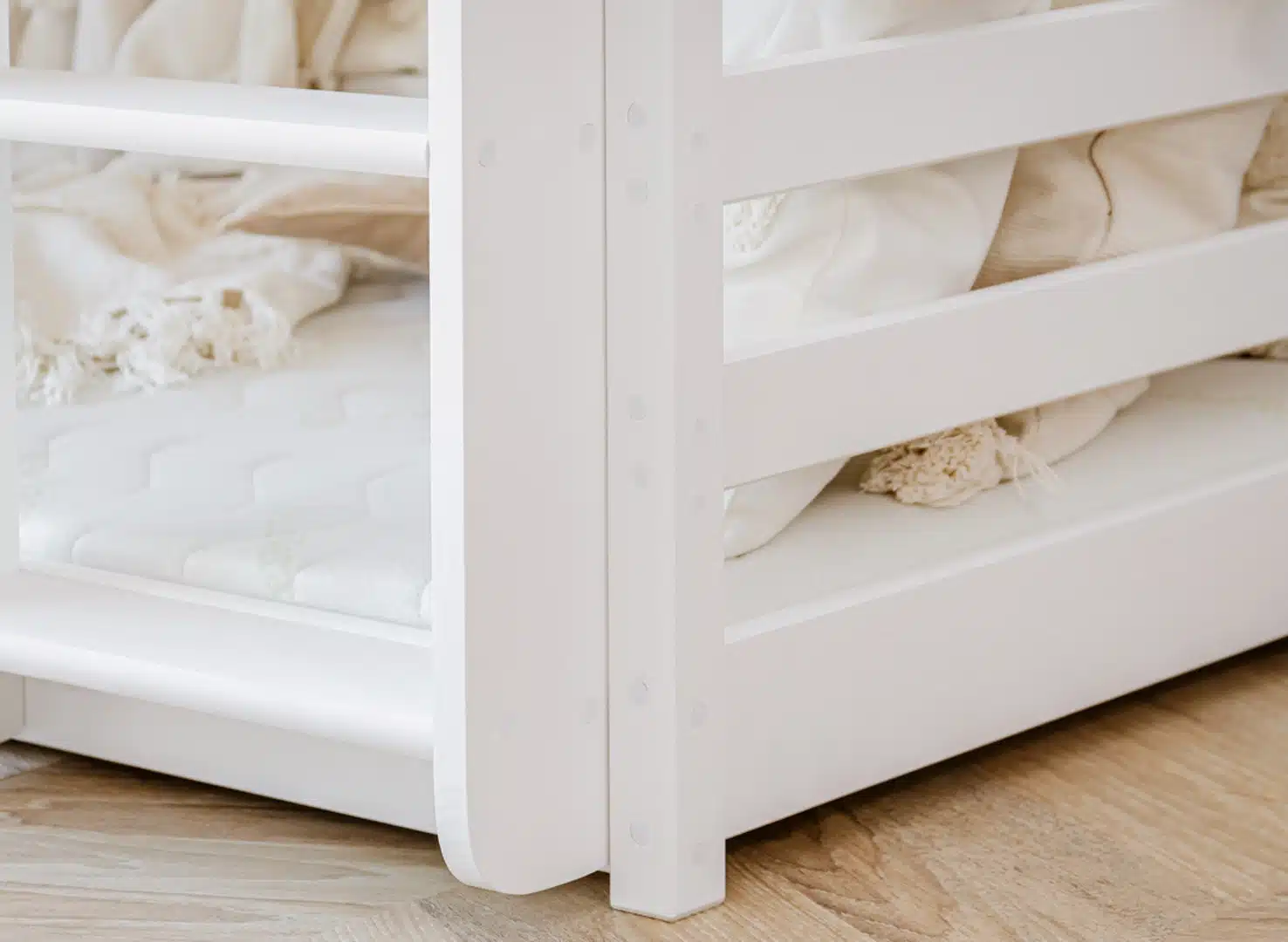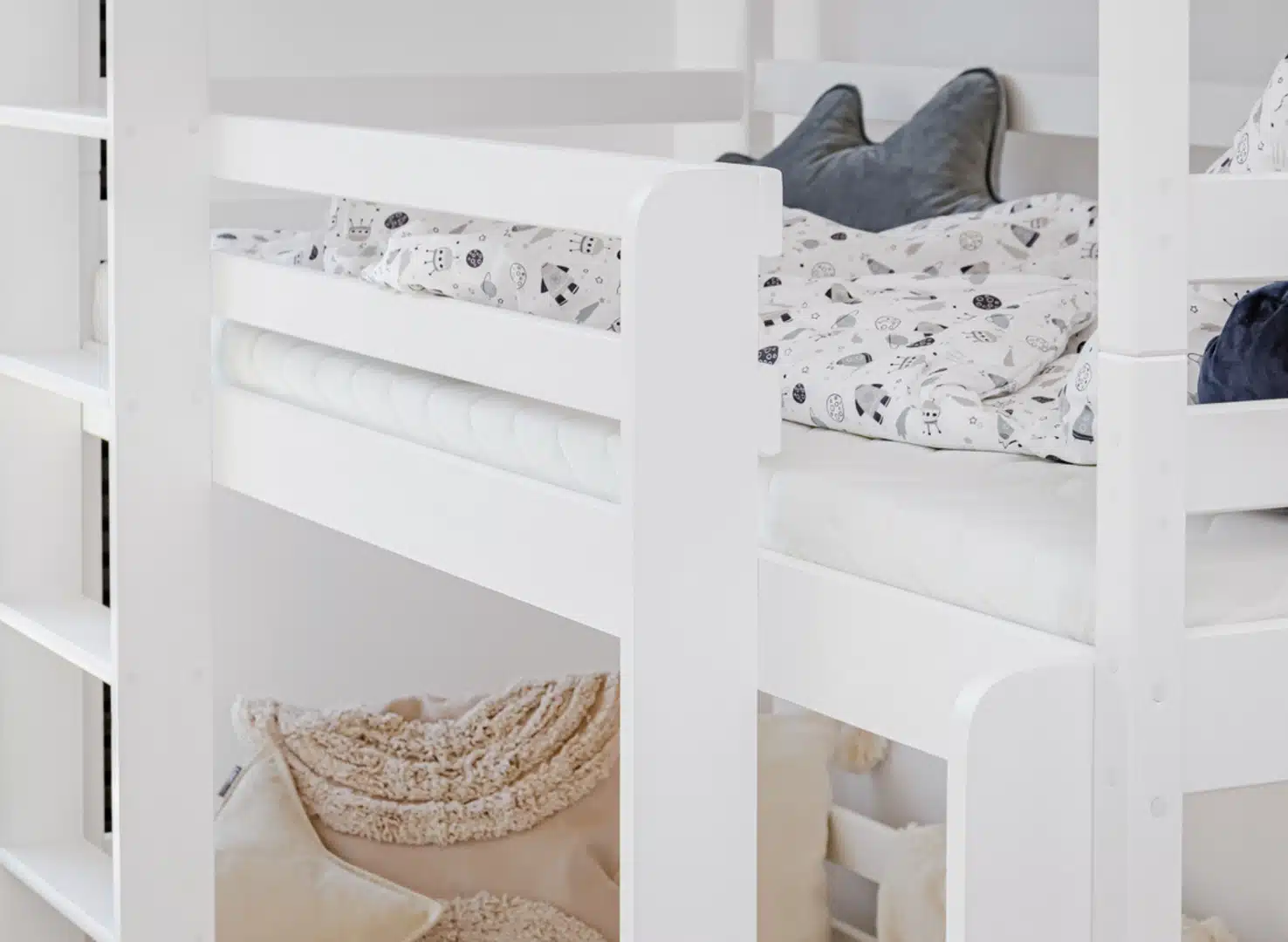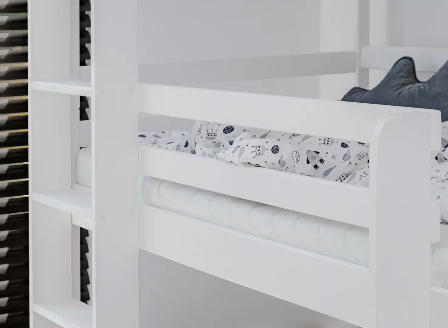 Ταυτόχρονα, η κατασκευή από μασίφ ξύλο πεύκου προσφέρει υψηλή αντοχή και σταθερότητα, ενώ οι οικολογικές βαφές νερού δημιουργούν ένα υγιεινό και ασφαλές περιβάλλον για τον ύπνο. Με αυτόν τον τρόπο, η κουκέτα συνδυάζει ποιότητα, ασφάλεια και διαχρονικό σχεδιασμό, αποτελώντας μια ολοκληρωμένη επιλογή για κάθε παιδικό δωμάτιο.