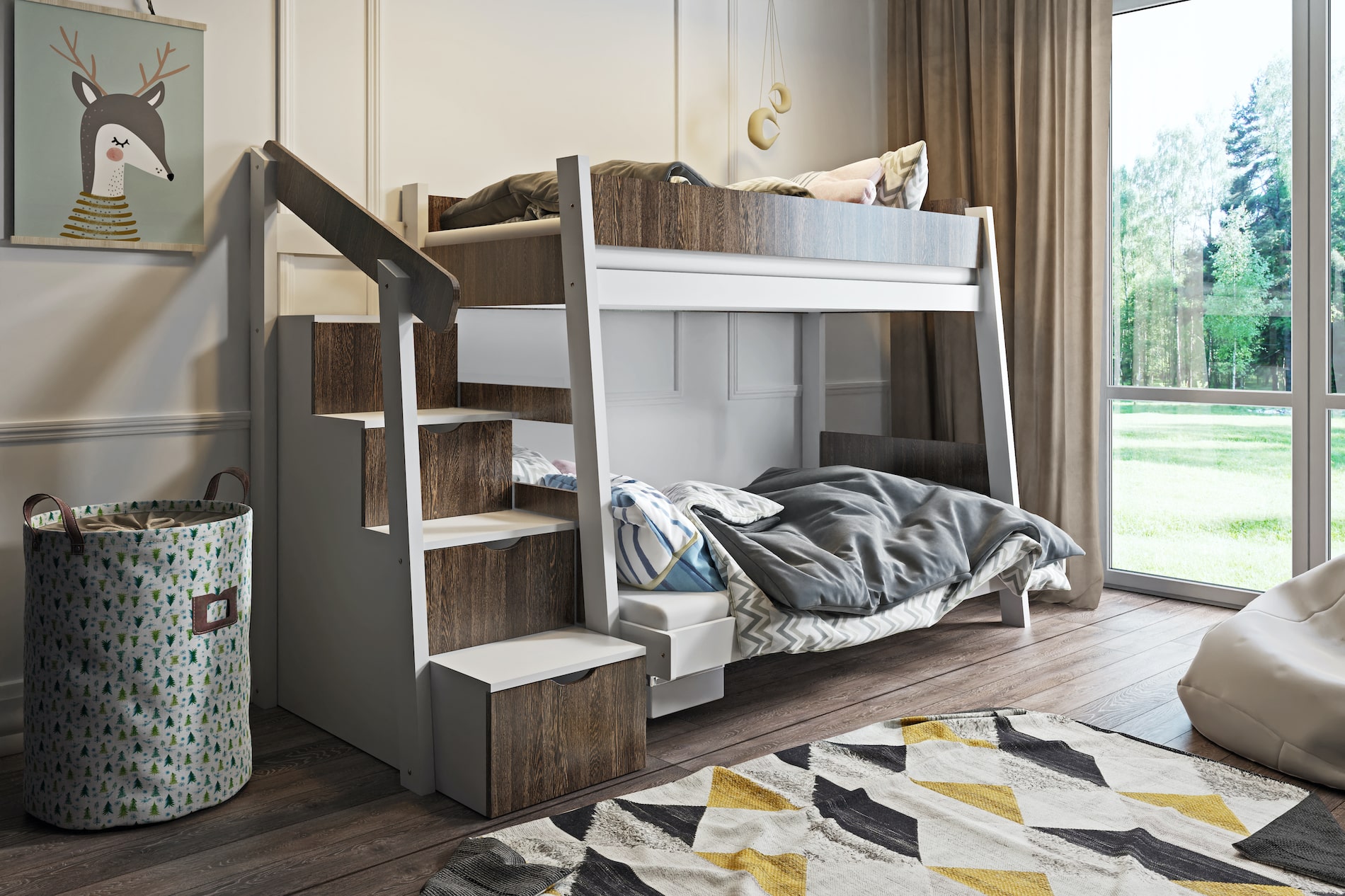 Ένα από τα στοιχεία που ξεχωρίζουν στην κουκέτα Parys για τρία παιδιά είναι η σκάλα με ενσωματωμένα συρτάρια αποθήκευσης. Η σκάλα προσφέρει ασφαλή και άνετη αναρρίχηση, ενώ κάθε σκαλοπάτι ανοίγει ως συρτάρι, δημιουργώντας πρακτικό χώρο για ρούχα, παιχνίδια, παπούτσια ή αξεσουάρ. Έτσι, το παιδικό δωμάτιο παραμένει οργανωμένο χωρίς επιπλέον έπιπλα.