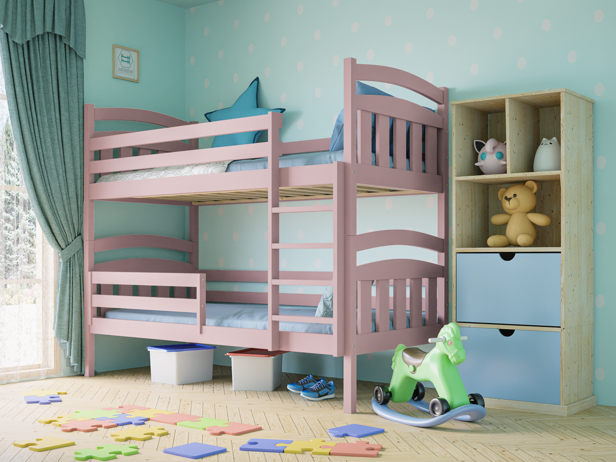 Η κουκέτα Sofia για δύο παιδιά προσφέρει άνετο και ασφαλή ύπνο, ενώ παράλληλα δίνει κομψό και ζεστό χαρακτήρα στο παιδικό δωμάτιο χάρη στα καμπυλωτά πλαϊνά της. Έτσι, δημιουργείτε έναν χώρο που συνδυάζει λειτουργικότητα και αισθητική.