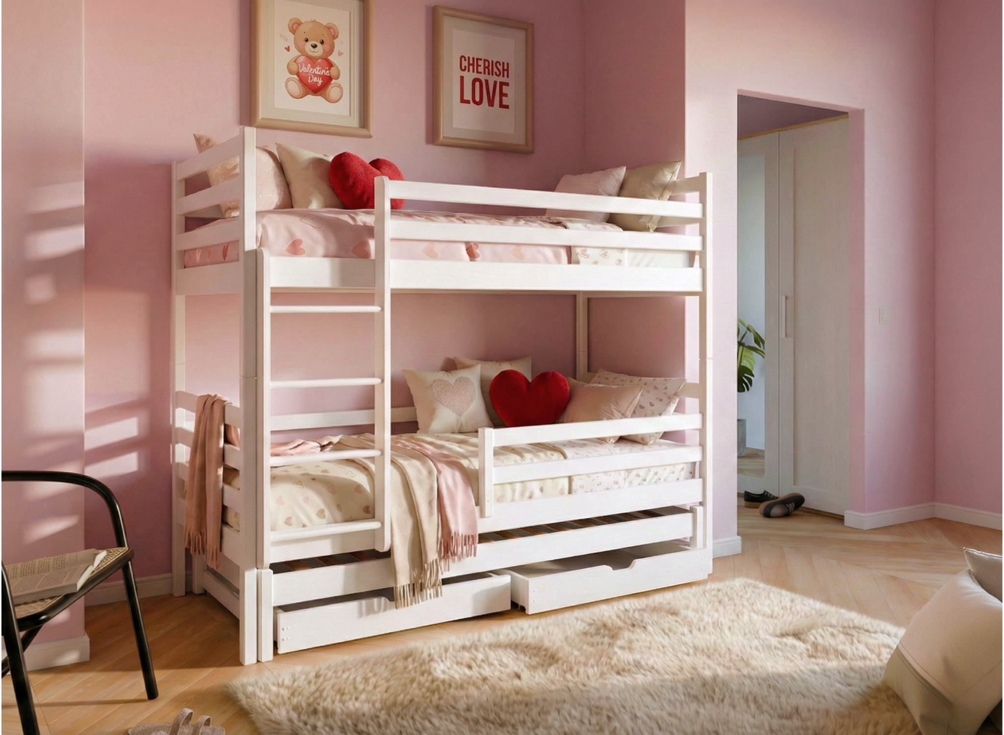 Η κουκέτα για τρία παιδιά από μασίφ ξύλο πεύκου με συρόμενο κρεβάτι προσφέρει ιδανική λύση για οικογένειες που θέλουν να εξοικονομήσουν χώρο και ταυτόχρονα να εξασφαλίσουν άνετο ύπνο για τρία παιδιά στο ίδιο δωμάτιο. Επιπλέον, το τρίτο συρόμενο κρεβάτι δημιουργεί άμεσα επιπλέον θέση ύπνου, ενώ τα συρτάρια βοηθούν στην οργάνωση του χώρου.