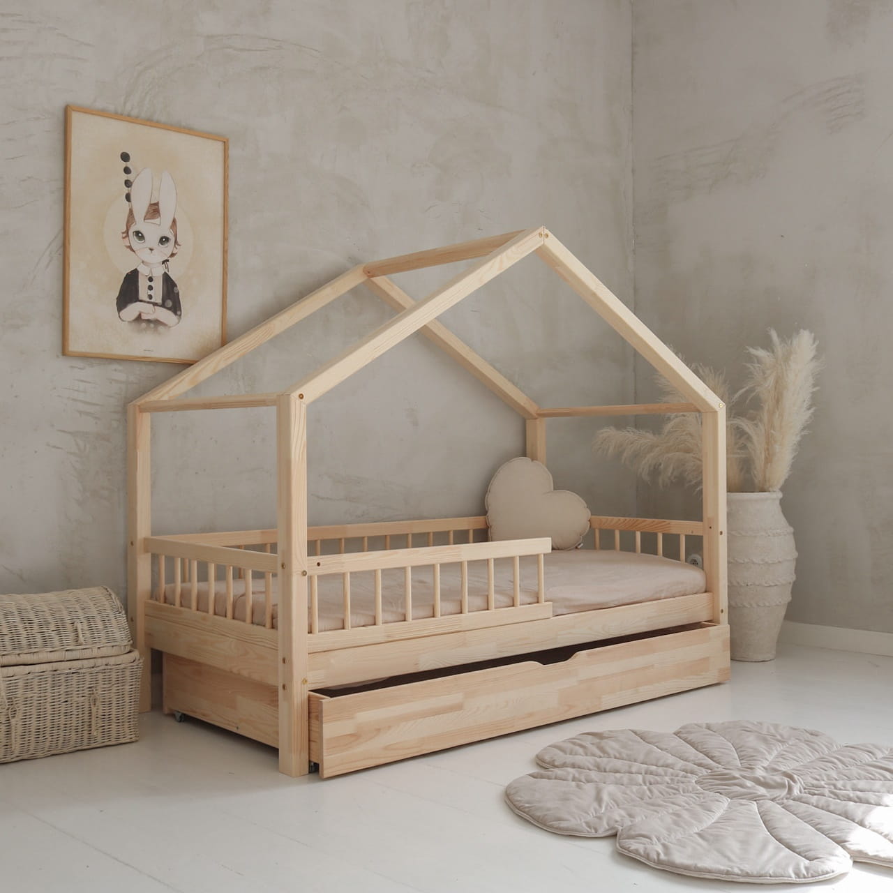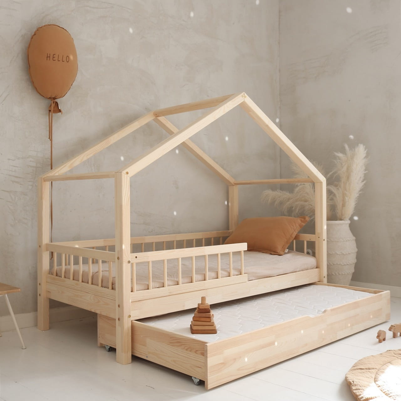 Το κρεβάτι Montessori HouseBed Bello  Plus είναι ένα χαμηλό κρεβάτι με σχέδιο σπιτάκι από πάνω. Μπορείτε να επιλέξετε συρτάρι ως δεύτερο κρεβάτι ή ενιαίο συρτάρι ως χώρο αποθήκευσης σύμφωνα με τις ανάγκες σας.