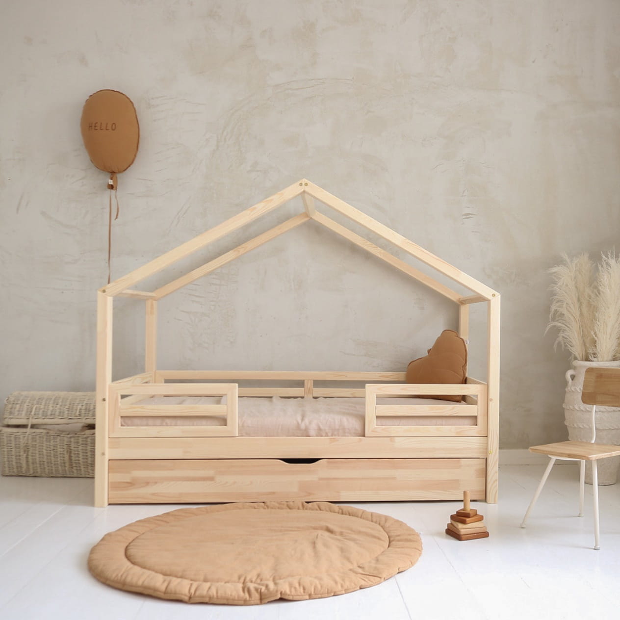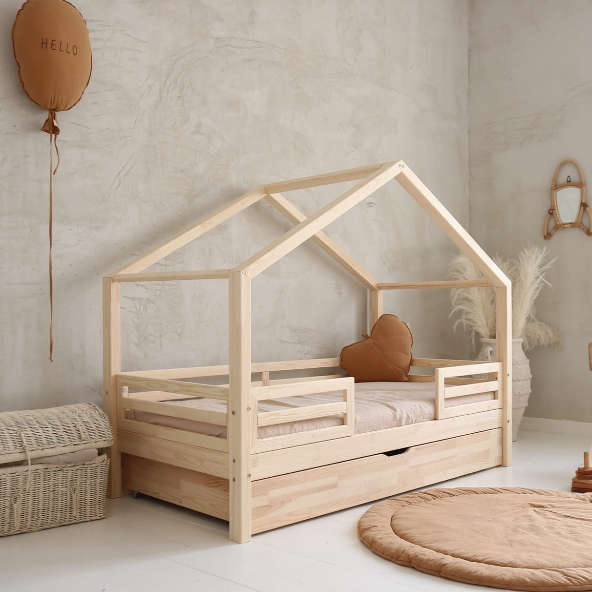 Κρεβάτι Παιδικό Montessori HouseBed Fello Plus με Αφαιρούμενα Κάγκελα 23cm & Συρτάρι σε Φυσικό Ξύλο 90×200cm Luletto (Δώρο 10% έκπτωση στο Στρώμα)