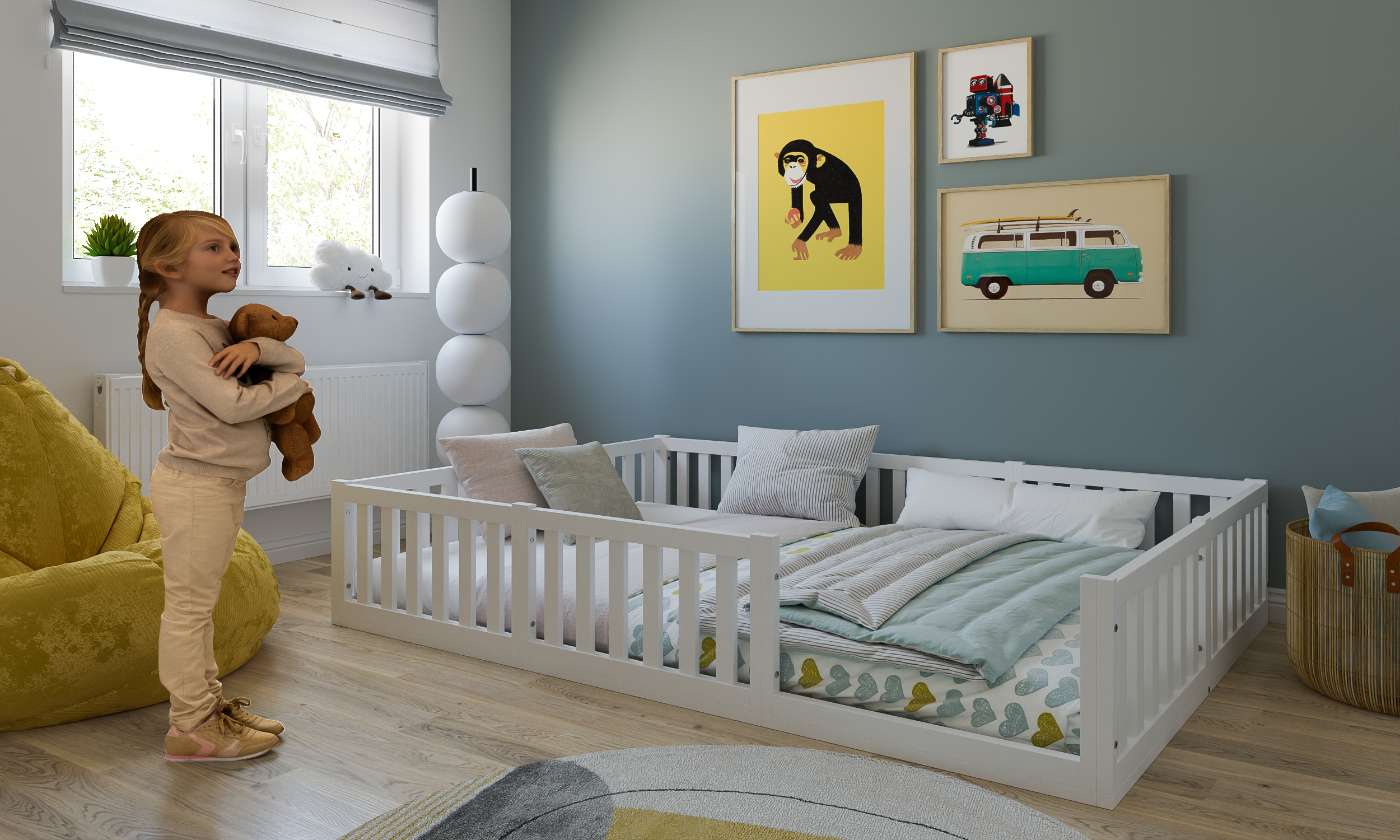Το Montessori κρεβάτι Teso δημιουργεί έναν φωτεινό και ασφαλή χώρο ύπνου, καθώς συνδυάζει τον χαμηλό σχεδιασμό Montessori με κάθετα κάγκελα που προσφέρουν σταθερότητα και προστασία. Παράλληλα, το παιδί κινείται με άνεση και αυτονομία μέσα στον προσωπικό του χώρο.