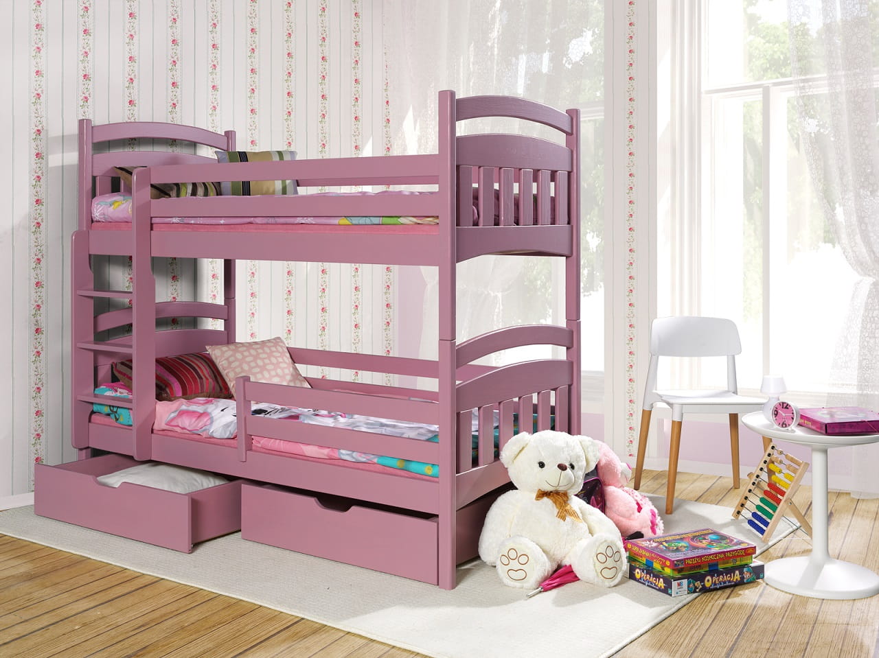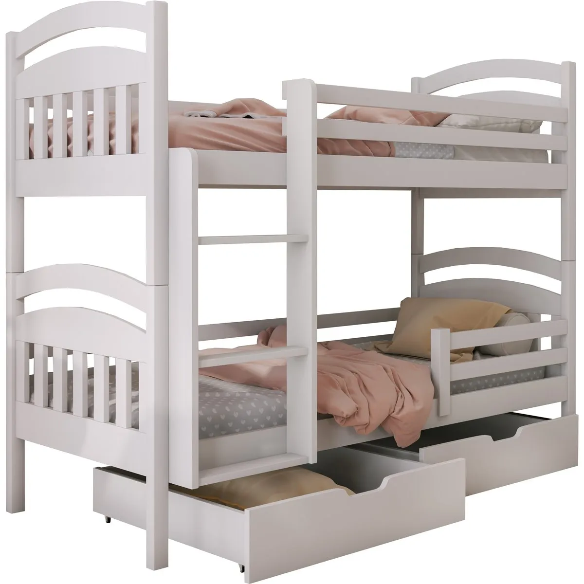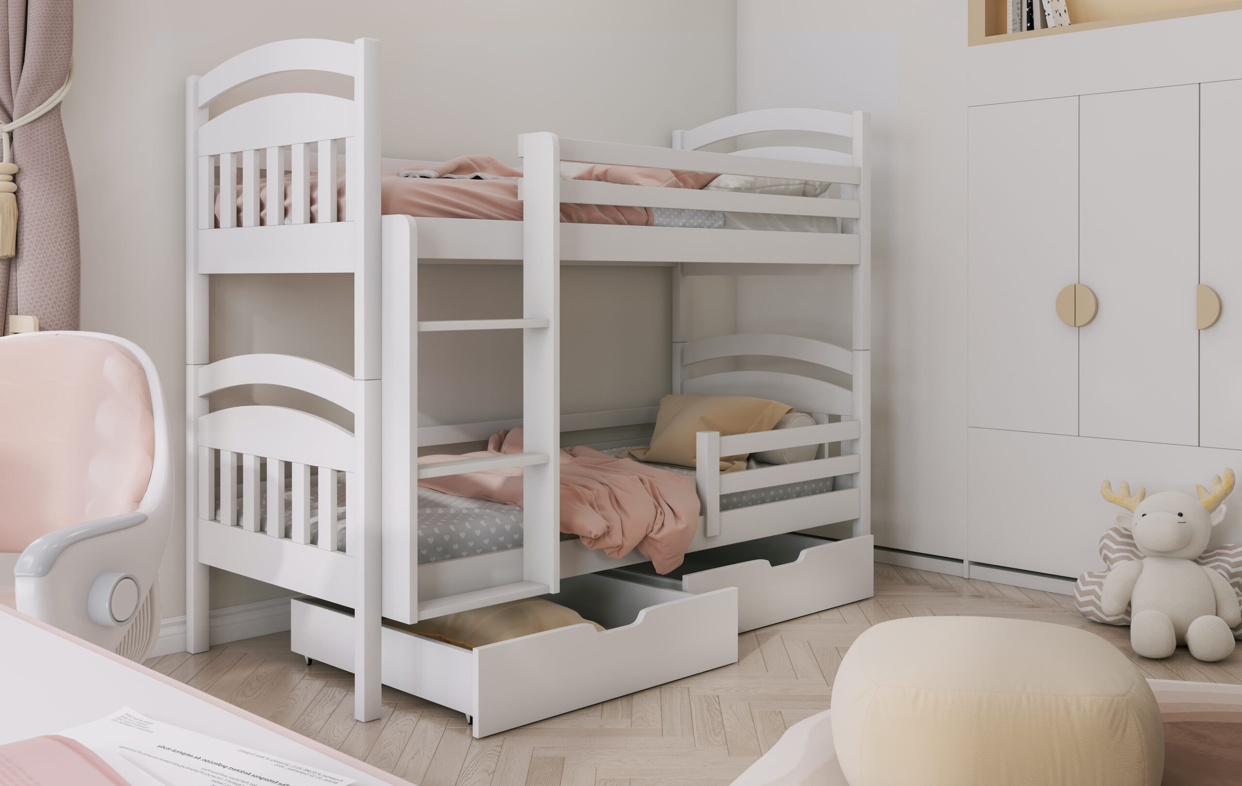 Επιπλέον, η παιδική κουκέτα Jakub για δύο παιδιά περιλαμβάνει δύο ευρύχωρα συρτάρια αποθήκευσης, τα οποία διευκολύνουν την οργάνωση κλινοσκεπασμάτων, παιχνιδιών και προσωπικών αντικειμένων. Έτσι, το δωμάτιο παραμένει τακτοποιημένο και λειτουργικό σε καθημερινή βάση.