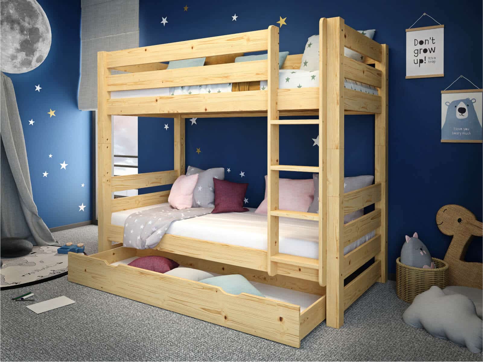 Η παιδική κουκέτα JAN από μασίφ ξύλο πεύκου μετατρέπεται σε δύο μονά κρεβάτια και προσφέρει επιλογή συρταριού αποθήκευσης ή τρίτου κρεβατιού.