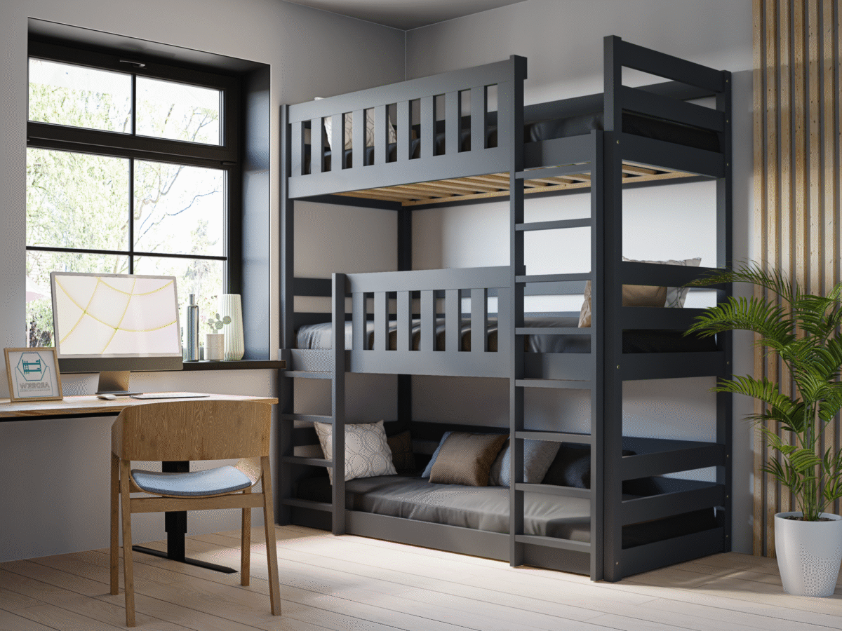 Κουκέτα Παιδική Montessori Τριώροφη Cozy Nest με κάγκελα 46cm από μασίφ ξύλο Graphite 90×200cm (Δώρο 10% Έκπτωση στα Στρώματα)