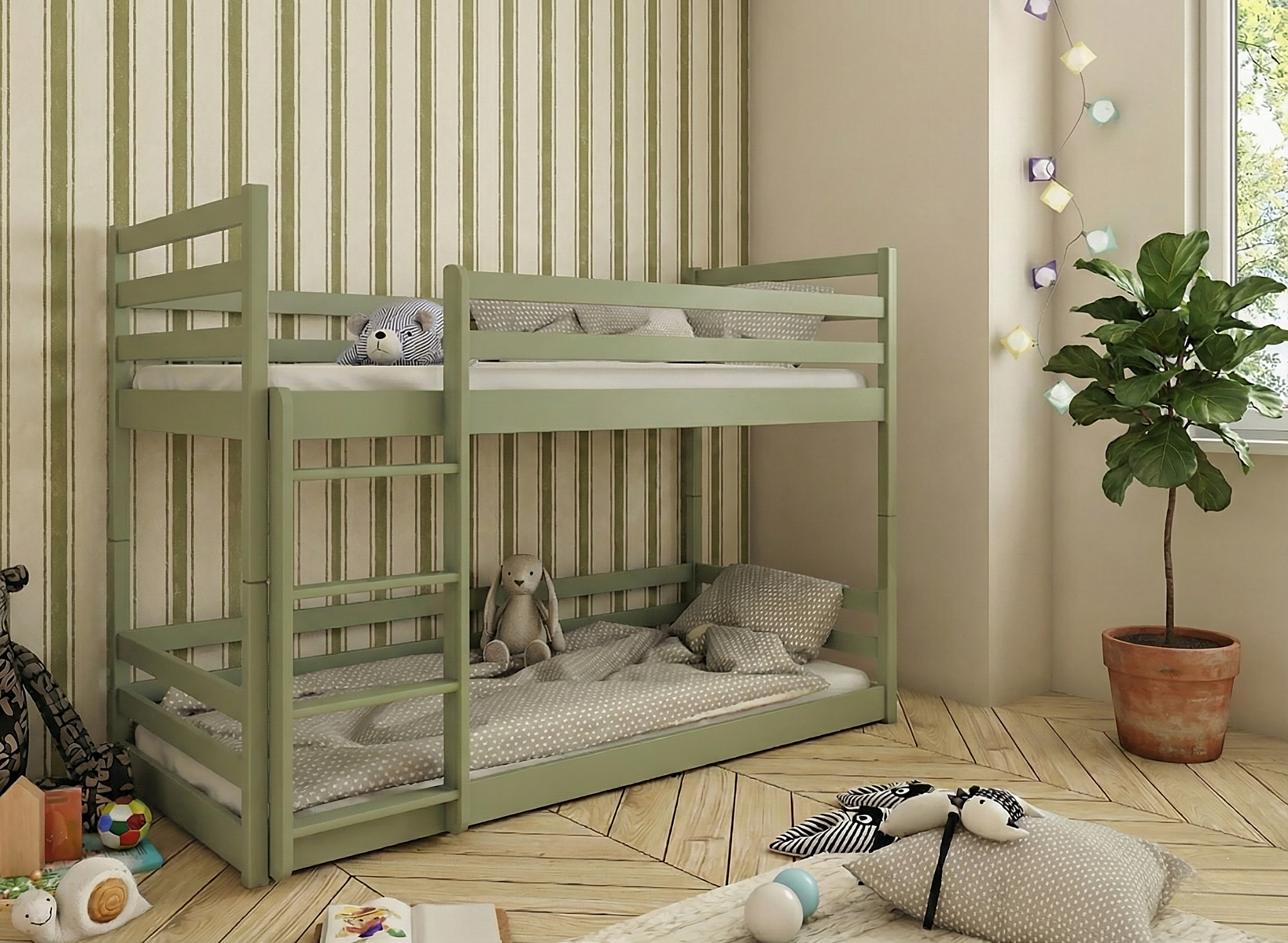 Παράλληλα, η κατασκευή από μασίφ ξύλο πεύκου προσφέρει υψηλή αντοχή, σταθερότητα και φυσική αισθητική, δημιουργώντας μία ζεστή και φιλόξενη ατμόσφαιρα στο παιδικό δωμάτιο.