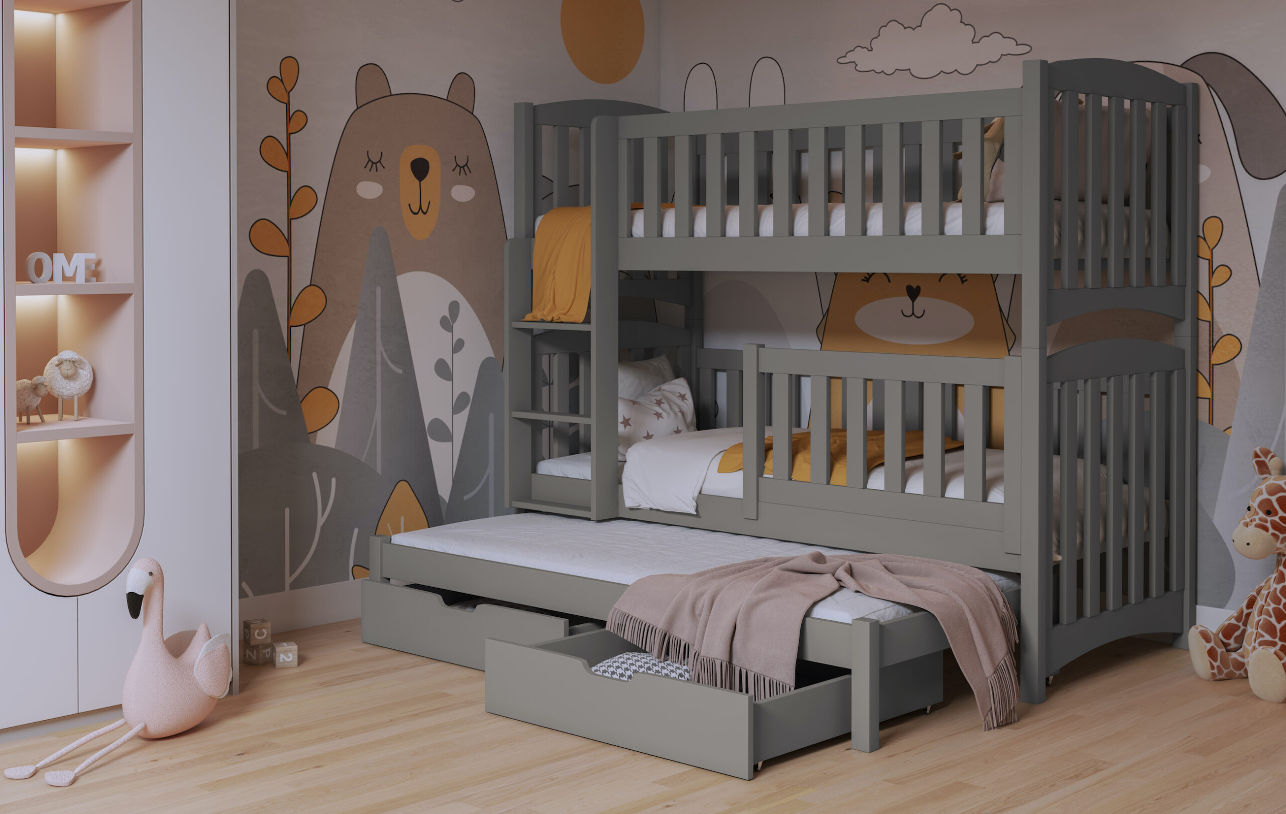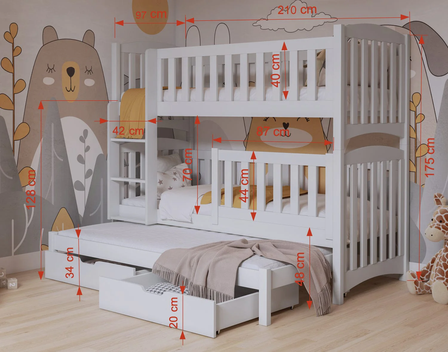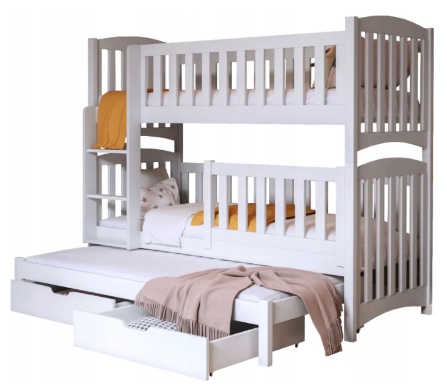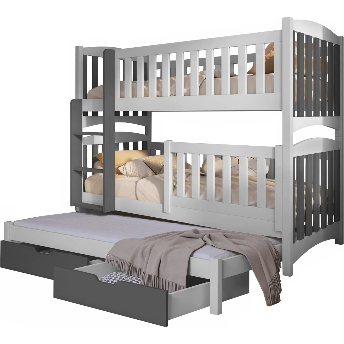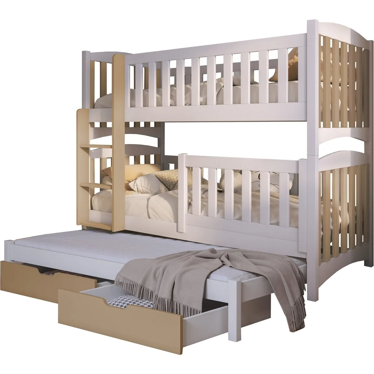 Η παιδική κουκέτα Nathan με συρόμενο κρεβάτι για τρία παιδιά προσφέρει μία έξυπνη και απόλυτα λειτουργική λύση για οικογένειες που θέλουν να αξιοποιήσουν σωστά τον χώρο στο παιδικό δωμάτιο. Παράλληλα, το τρίτο συρόμενο κρεβάτι και τα δύο πρακτικά συρτάρια διευκολύνουν την καθημερινή οργάνωση και καλύπτουν τις ανάγκες ύπνου χωρίς επιπλέον έπιπλα.