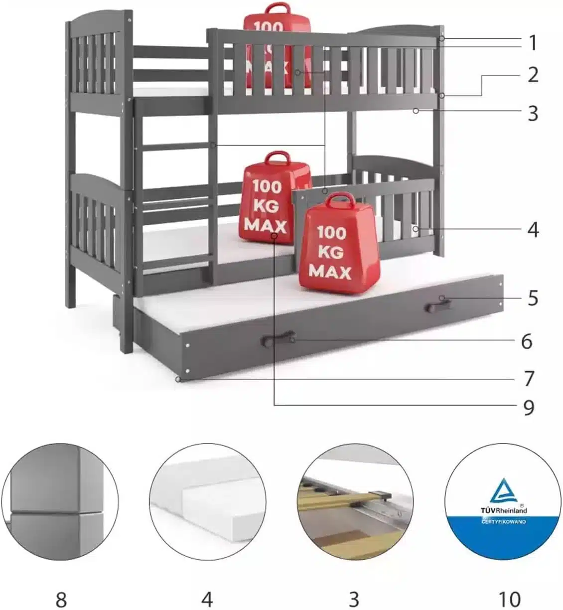 - Το συρτάρι χρησιμοποιείται ως 3ο κρεβάτι και είναι κατασκευασμένο από πλαστικοποιημένη μοριοσανίδα με πρόσθετη λειτουργία ύπνου.