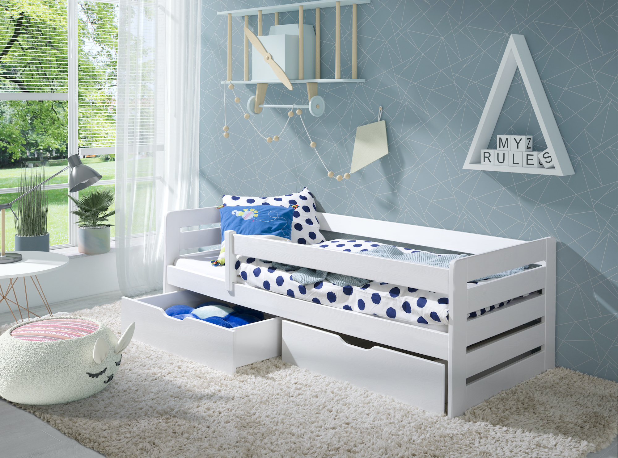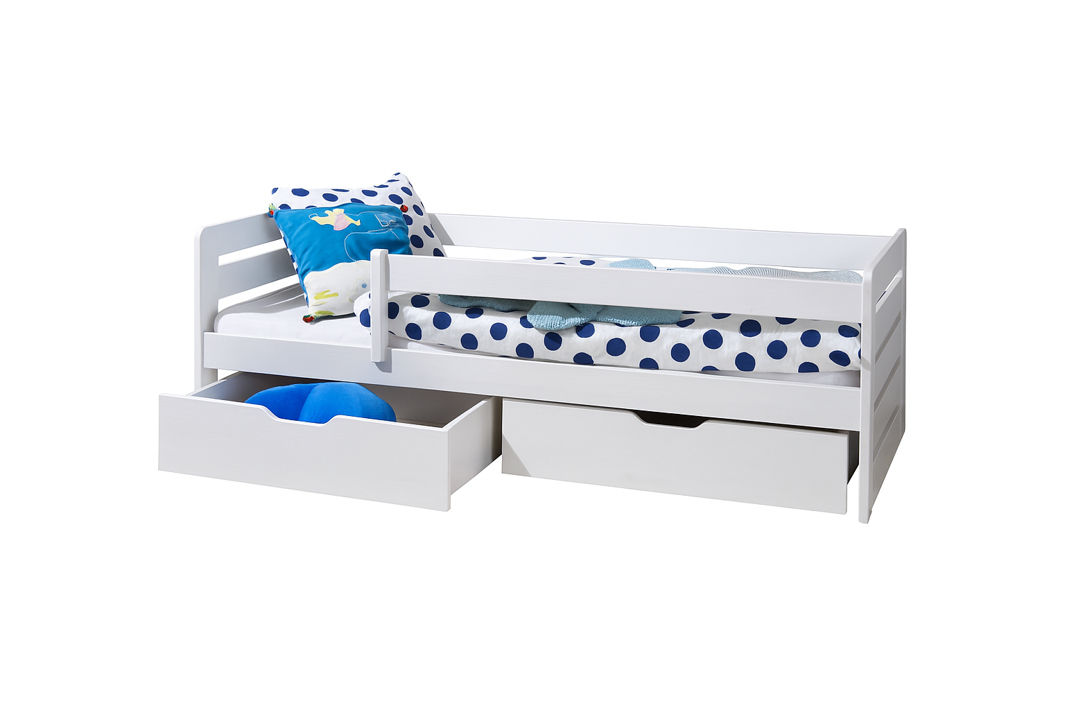 Παιδικό κρεβάτι Bella από μασίφ πεύκο, με προστατευτικό κάγκελο και δύο συρτάρια αποθήκευσης, διαθέσιμο σε επιλογή χρώματος.